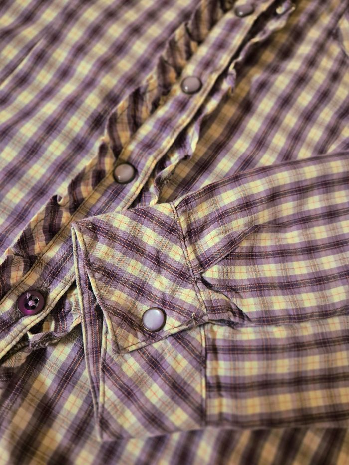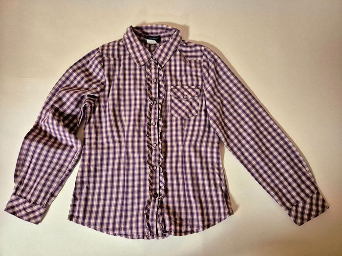 On adore ! Top tendance cette chemise à carreaux dans les tons violet. Col chemise. Manches longues avec poignets à bouton pression. Ouverture devant avec boutons pression. Volants sur l'ouverture devant.