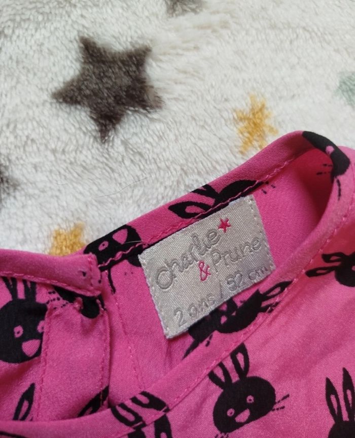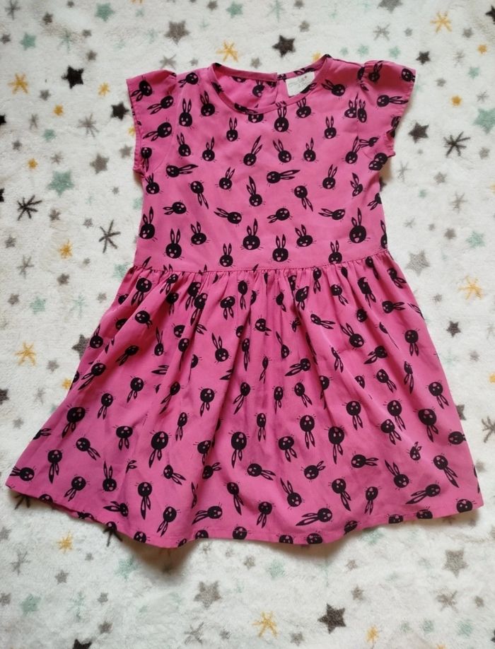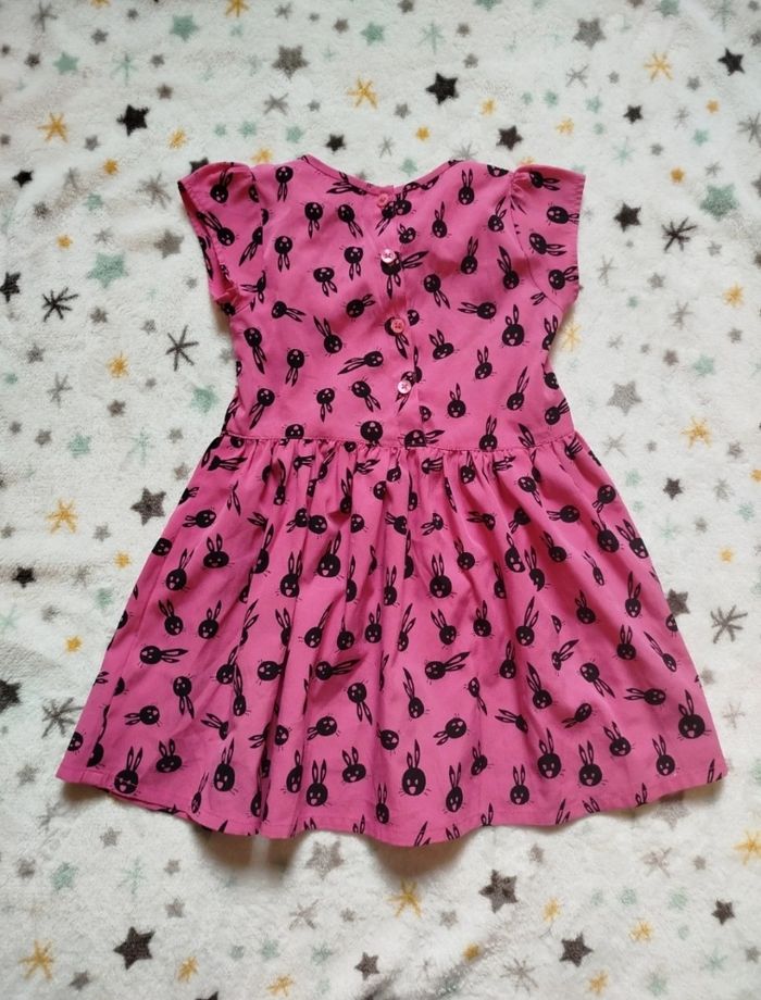 Robe rose fushia, motifs têtes de lapin noires. Imperfection visible en dernière photo ( un fil tiré). Charlie & Prune, taille 2 ans. G51