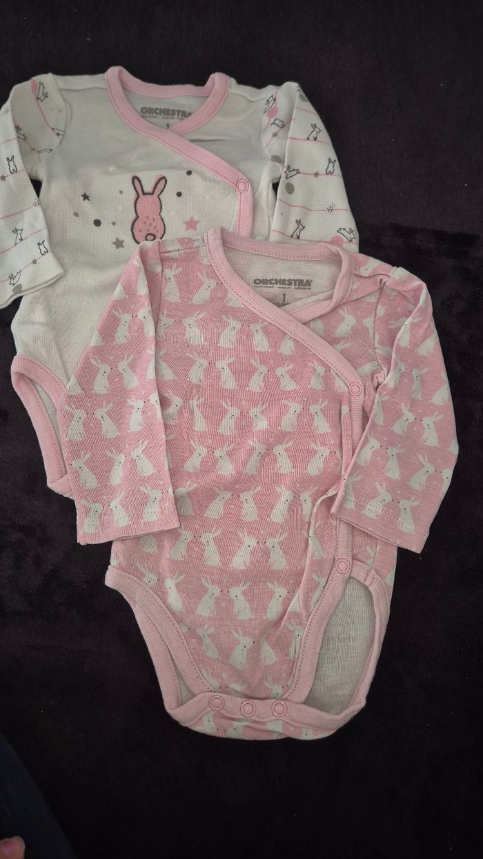 Vend ce lot de 2 bodies manches longues, de taille 1 mois, en très bon état de marque orchestra