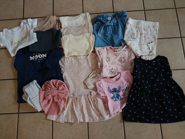 Short KIABI : Neuf jamais porté Robe bleue marine à fleur KIABI : neuve jamais portée Body Stich pastel épais : jamais porté Pyjama bleu marine KIABI : très bon état Pyjama Marine Rose Pale fin : jamais porté Robe rose épaisse avec tule : neuve jamais portée (micro accro au col) Body écriture jaune : très bon état Lot de 5 body ORCHESTRA Longues manches : presque pas portés Legging extensible : très bon état Bonnet noeud rose : neuf Collant : blanc doré offert très bon état Les vêtements on été lavés au moins une fois avec lessive de bébé (possible que certaines étiquettes qui grattent ont été enlevées).