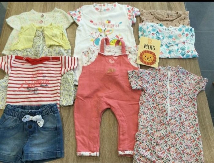 Lot 12 mois 1 maillot de bain 1 salopette avec son tee shirt 1 shirt manches longues et manches courtes 1robe 1 gilet 1 body éponge 1 pyjama fin (petites tâches au col)