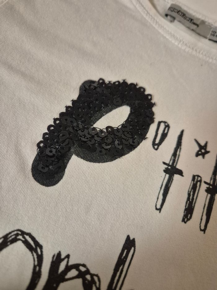 Tee-shirt imprimé et brodé de sequins. Manches courtes avec petites froncés. Col rond