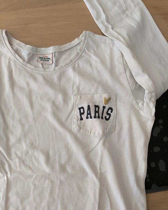 Un t-shirt manches longues blanc, très bon état. Marque TAPE A L'OEIL, taille 10 ans