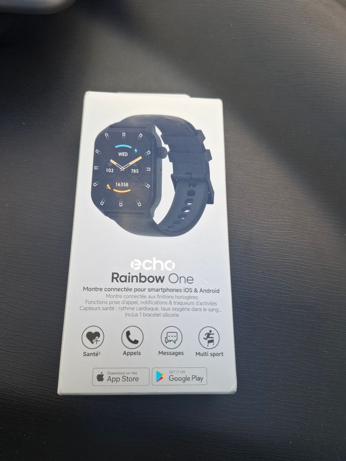 Je vends une montre connectée Echo Rainbow One, neuve, jamais utilisée, encore sous emballage d’origine. Compatible Android et iOS. ✨ Fonctions : Suivi santé : fréquence cardiaque, taux d’oxygène dans le sang Notifications : appels, messages Multi-sport / suivi d’activités Écran tactile Bracelet silicone inclus Fait mixte 📦Envoi rapide et soigné