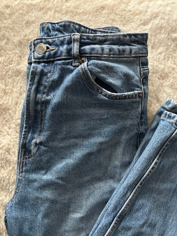 Jean coupe mom bleu, taille haute, confortable et tendance. Facile à porter au quotidien, en très bon état.