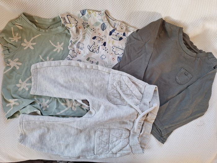 Lot assortiment vêtements garçon 18 Mois (marques connues) 6 pièces 1 pantalon jogging écru tape à l’œil 1 veste kaki tape à l'oeil 1 sweat vert à motifs orchestra 1 tee shirt manches longues Vert vert baudet 2 tee shirt manches courtes petit beguin et orchestra Prix 10€