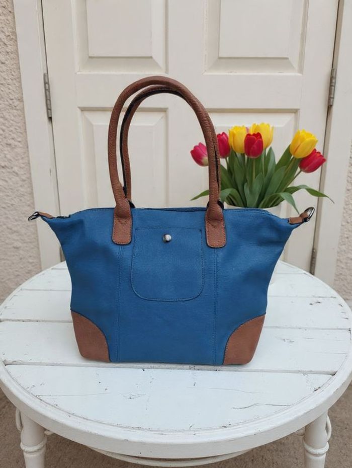grand sac cabas fourre-tout marque Hestia en simili cuir bleu et marron - photo numéro 1