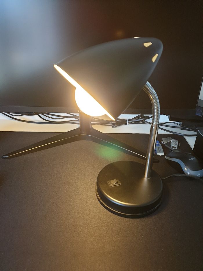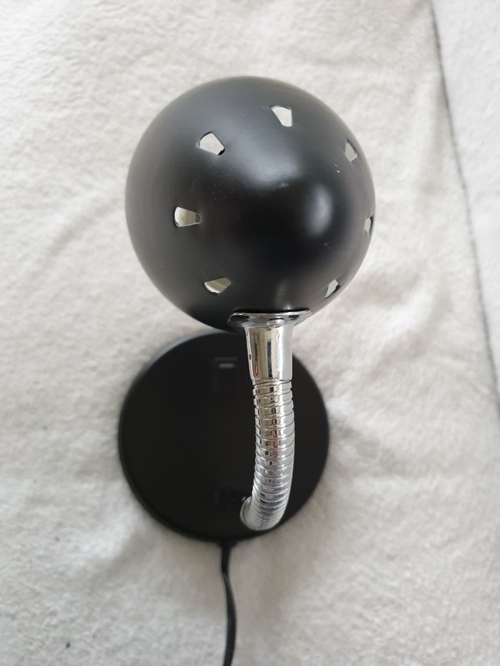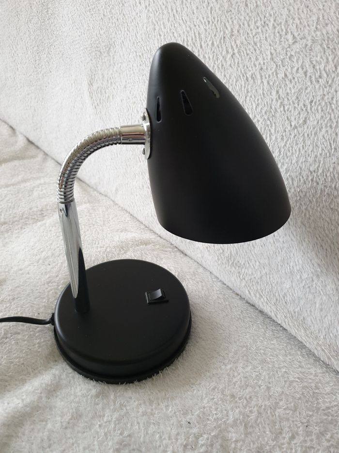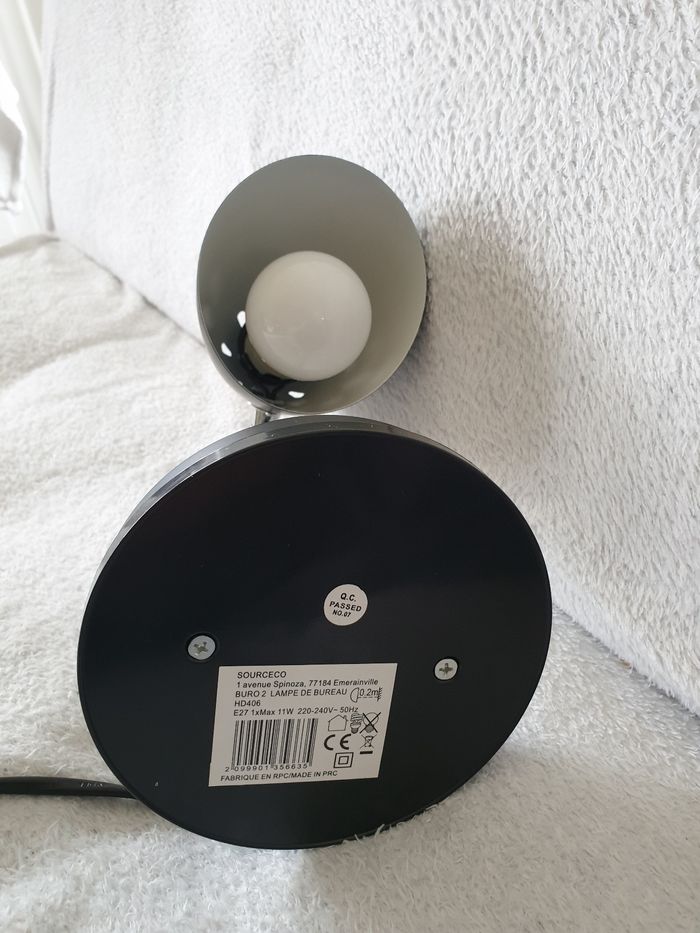 Lampe à poser de chevet ou de bureau... Avec un long câble d'alimentation, il mesure environ 1,60m. La tête est amovible et le bouton et sur le pied. Le pied est lesté pour une meilleure stabilité. Elle mesure environ 37cm. Douille vis. Parfait état.