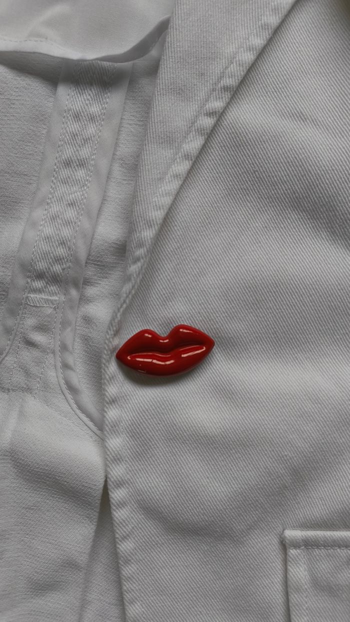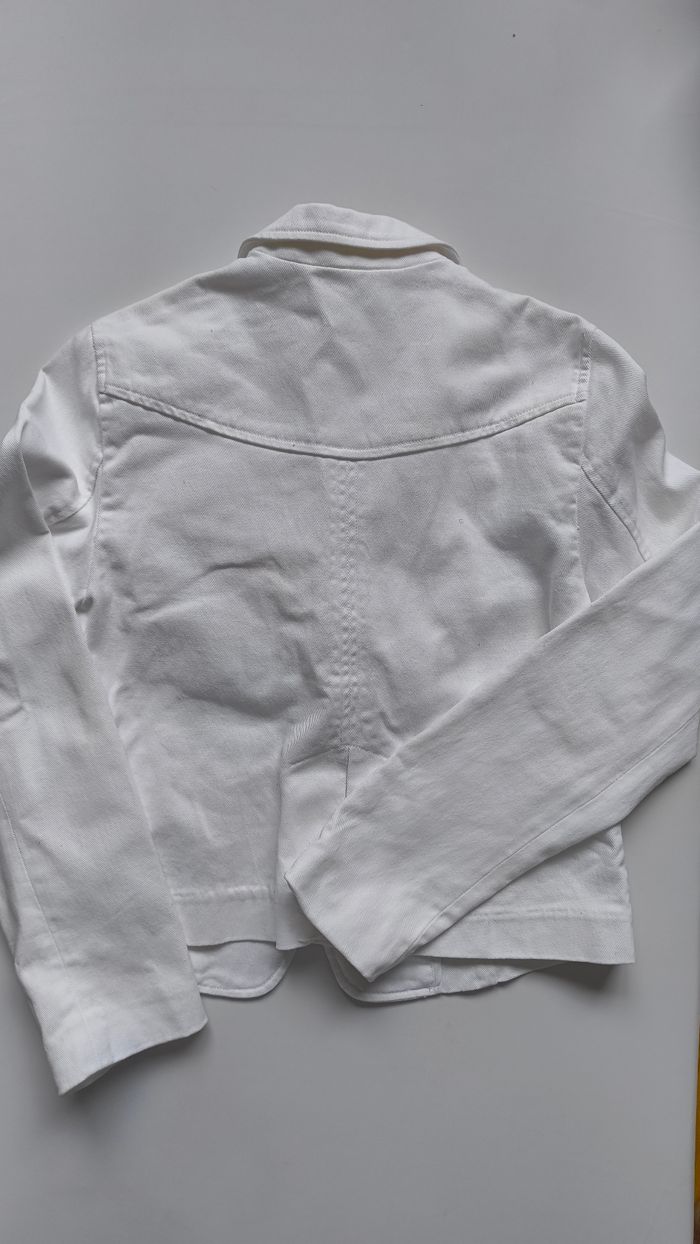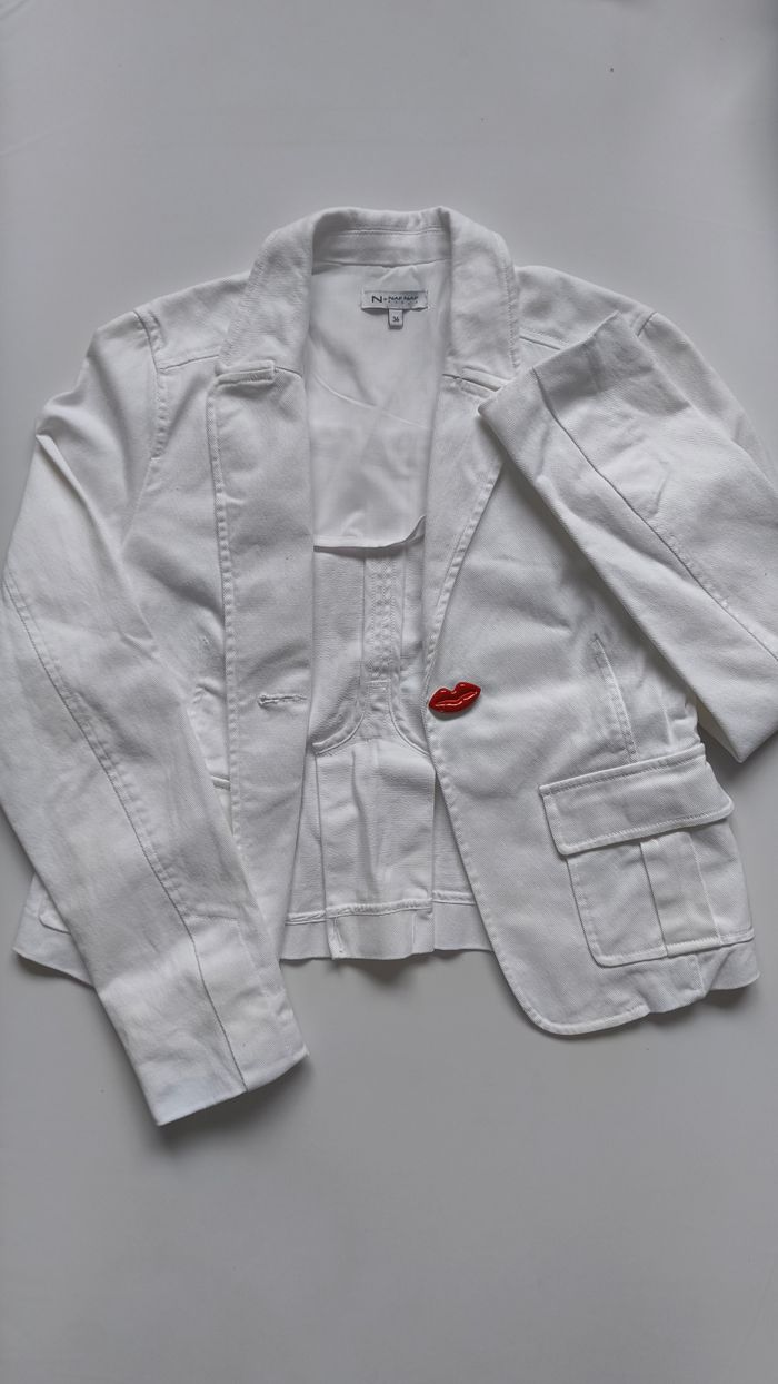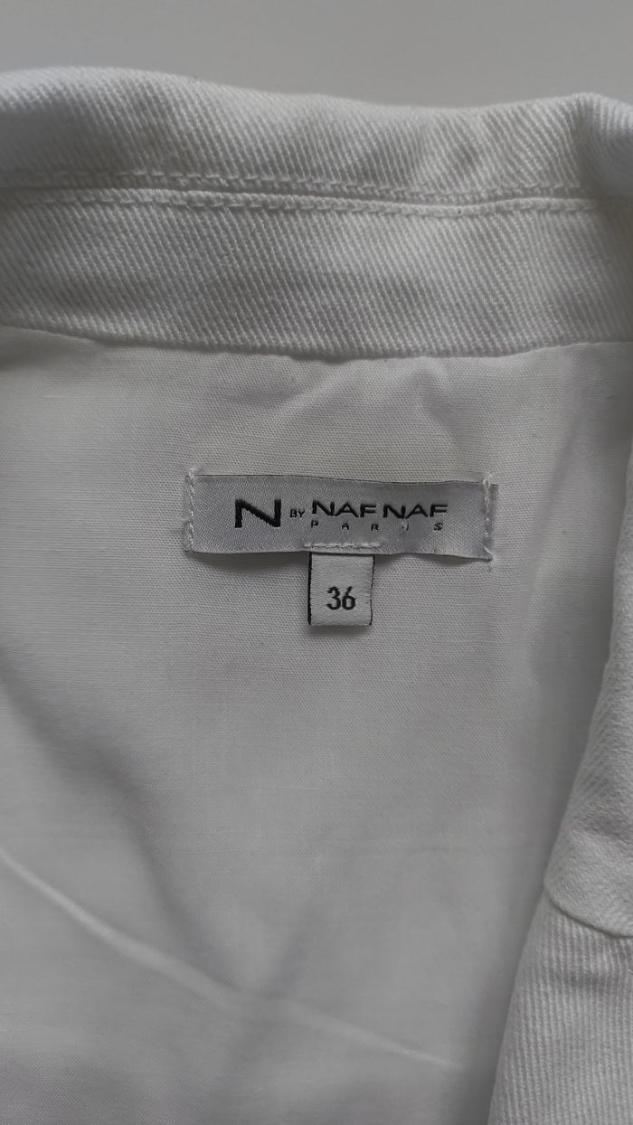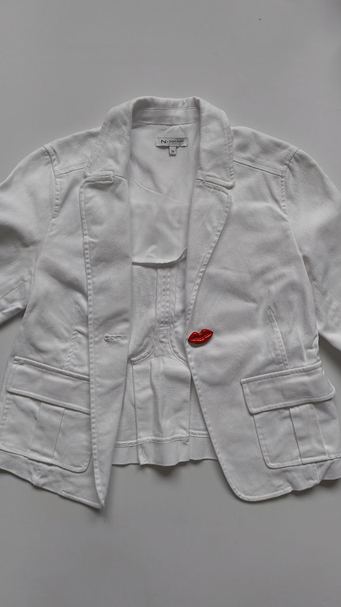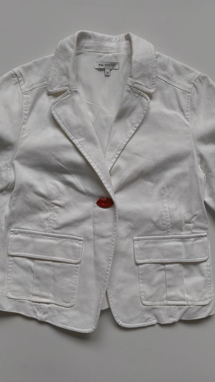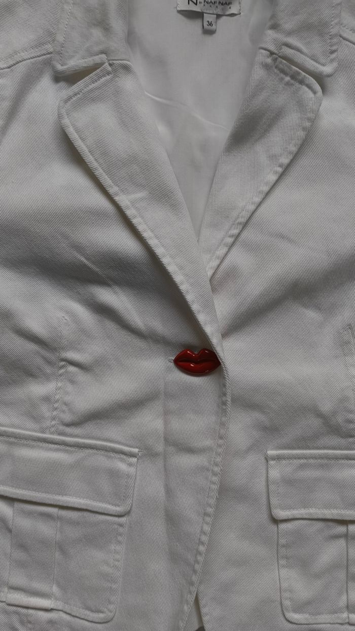 Veston jeans femme blanc marque Naf Naf, bouton en forme de lèvre rouge.en très bon état Coton 99% Largeur des épaules 37cm et longueur du veston 47 cm