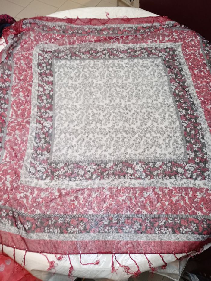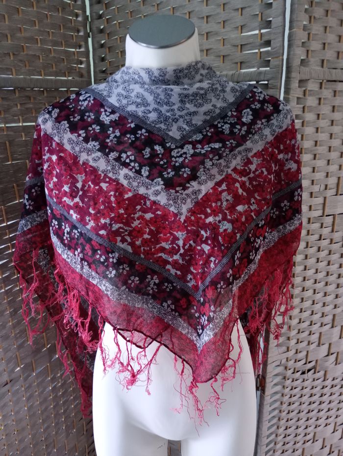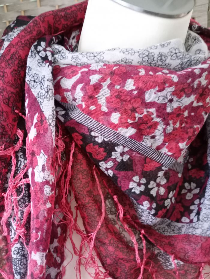 Foulard fin avec franges et motif de fleurs. Dimensions : 100 x 100 cm. Très bon état.