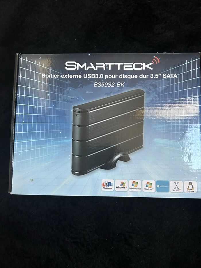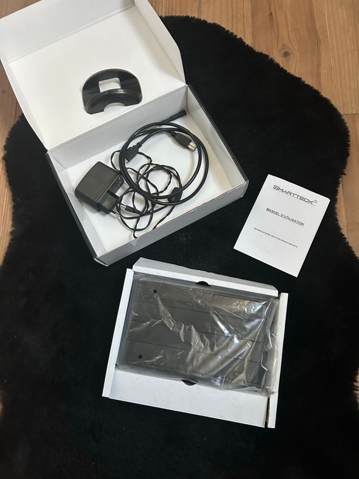 Disque dur externe Smartteck noir avec boîte d’origine, notice, support, câbles et accessoires. Fonctionne avec prise alimentation (fournie) et câble pour branchement externe via USB. Modèle b35932bk, stockage 1TO. Peu utilisé, en parfait état 👍