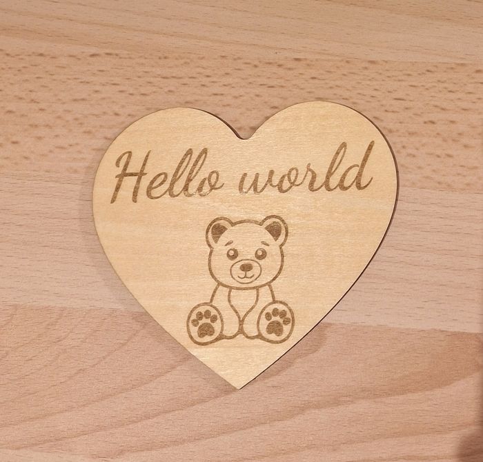 Vends plaque coeur motif nounours, inscription Hello world Dimention environ 10cm Épaisseur 3mm En matière bois de tilleul Possibilité d autres personnalisation, n hesitez pas a me contacter en message privé.