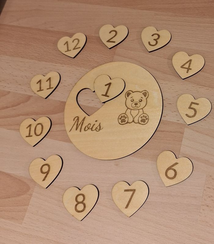 Vends cartes etapes mois bébé Interchangeable coeur Motif nounours En matière bois de tilleul N hesitez pas a me contacter en message privé, autres personnalisation possible.