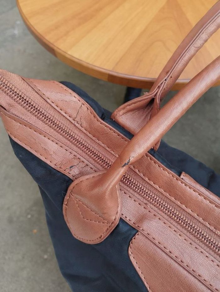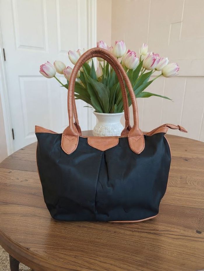 sac à main en toile, pratique et élégant au quotidien. Il dispose de deux anses en simili cuir marron (légèrement fendillé par endroits, ce qui n’altère ni le style ni l’usage). ✨ Détails : Fermeture éclair sur le dessus Intérieur doublé en tissu satiné noir 1 poche intérieure zippée pour vos essentiels Dimensions : 36 cm (largeur) x 25 cm (hauteur) Globalement en très bon état et prêt à trouver une nouvelle propriétaire ! N’hésitez pas à me contacter pour plus d’infos ou photos.