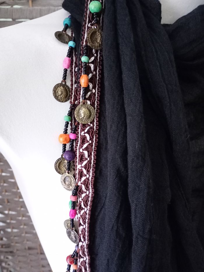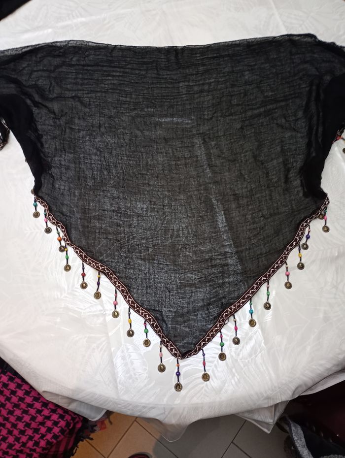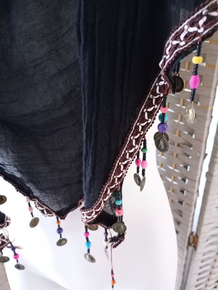 Foulard très original, noir avec perles et pièces. On entend le bruit des perles et des pièces lorsque l'on marche avec. Dimensions : 172 x 74 cm. Très bon état.