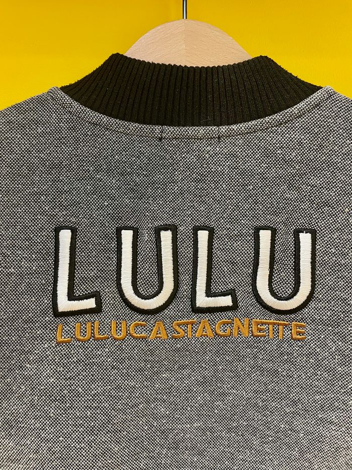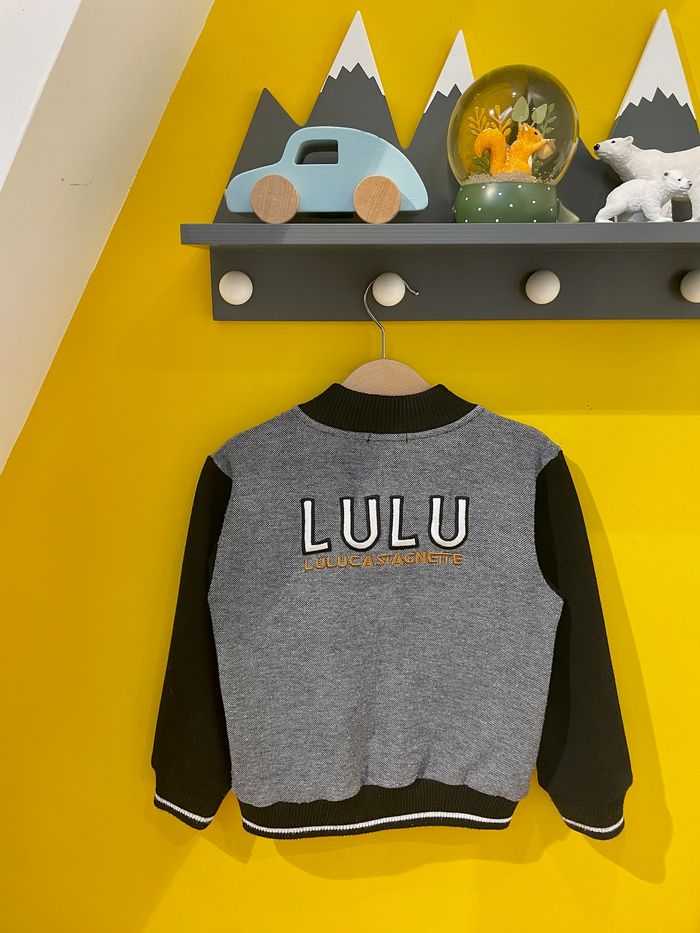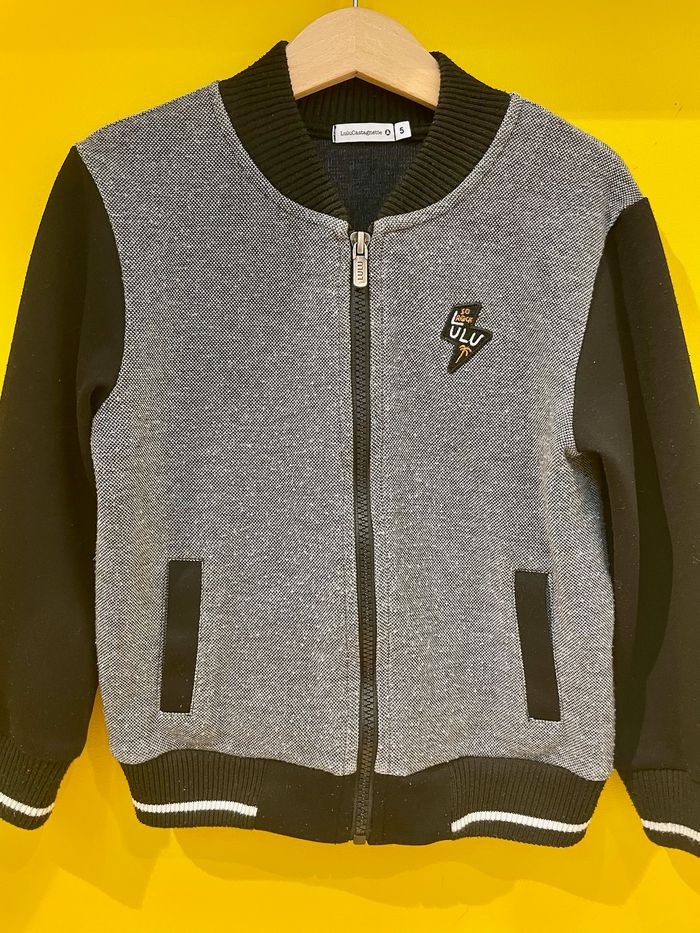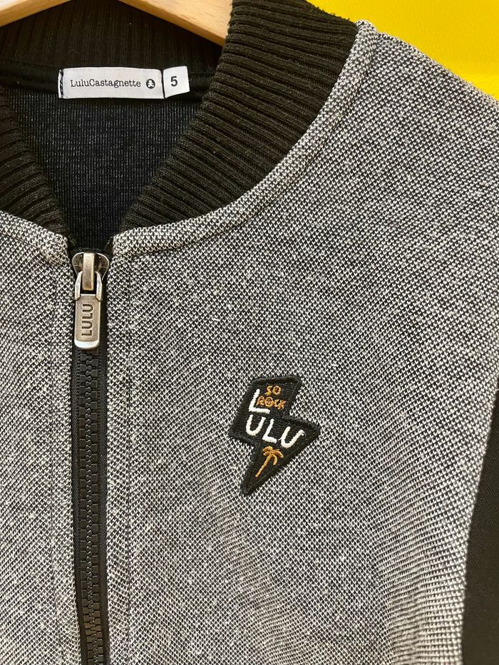 Veste gilet zippé style teddy ou baseball pour garçon de la marque Lulu Castagnette. Finitions bords-côtes. 2 poches avant. Petit patch 'Lulu' sur la poitrine. Grande broderie du nom de la marque dans le dos. Taille : 5 ans / 110 cm