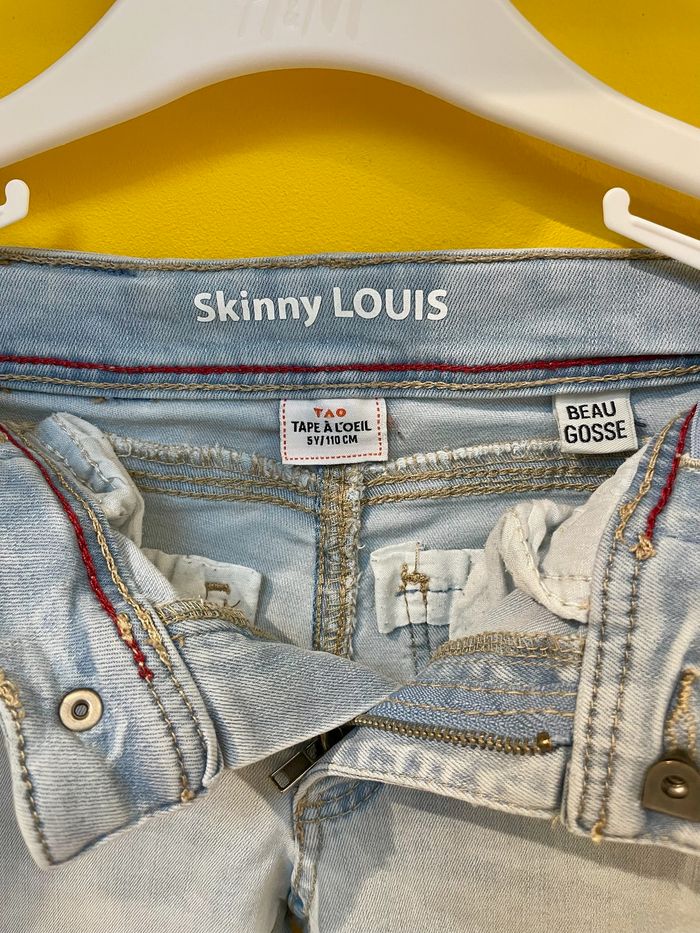 Jean skinny pour garçon de la marque Tape à l’œil.. 2 poches avant, 2 poches arrière. Ouverture par zip et bouton ergot. Ceinture intérieur de réglage de la taille. Patch imitation cuir avec écriteau 'Bande de potes' à l'arrière. Petite étiquette écriteau 'Beau gosse' à l'intérieur. Jean volontairement troué à un genou. Taille : 5 ans / 110 cm