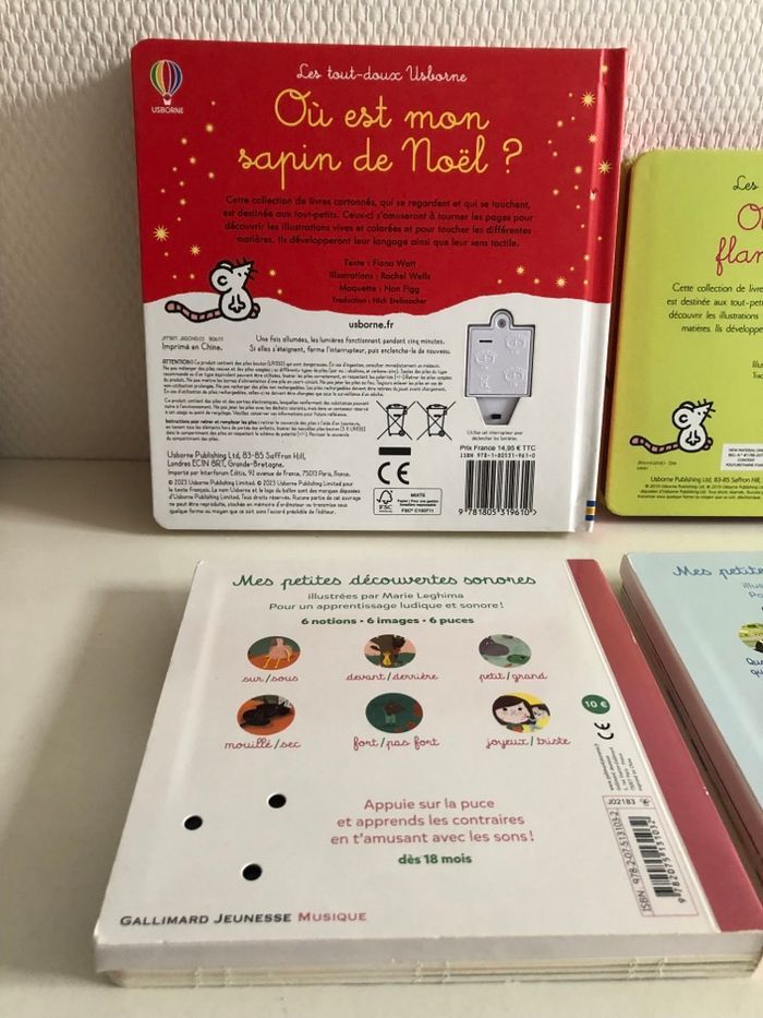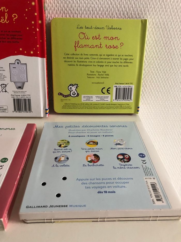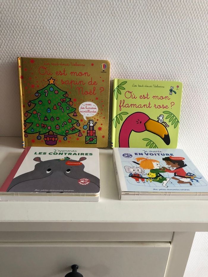 Lot de 4 livres 2 livres Ou est mon flamant rose ? et Où est mon sapin de noël ? 2 musicaux « j’apprends les contraires » et « je chante en voiture » très peu servis. Dès 18 mois Jamais utilisés