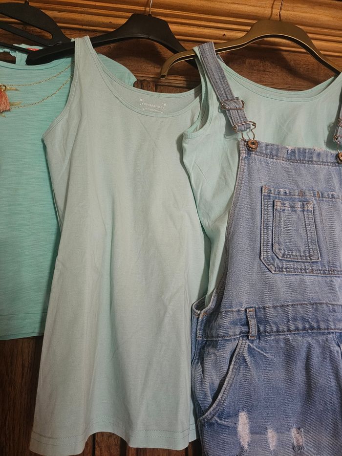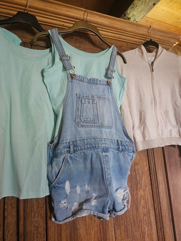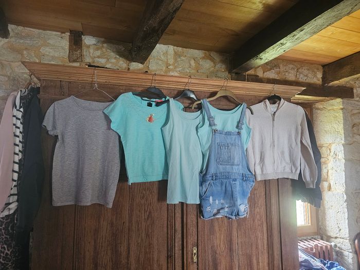 1 t-shirt plus 1 gratuit, 2 top, 1 salopette short en jeans Zara, 1 gilet Monoprix t 14/15 ans
