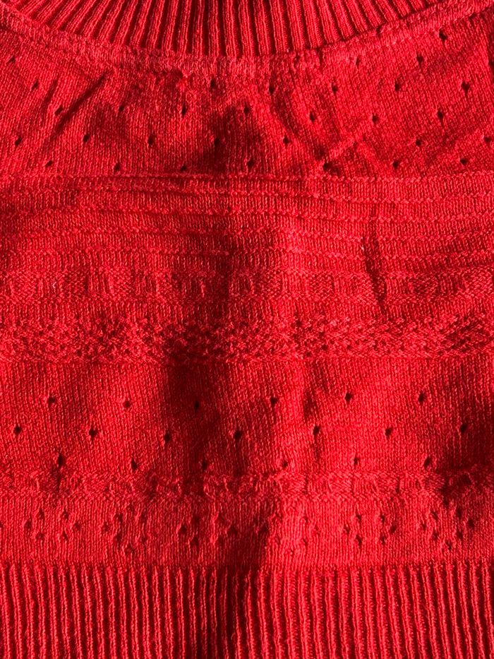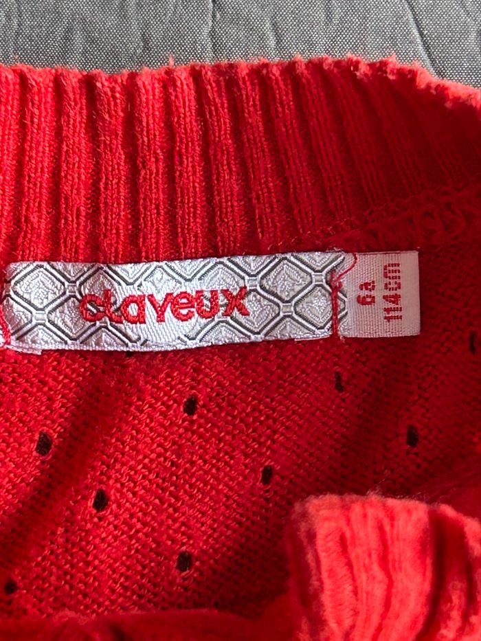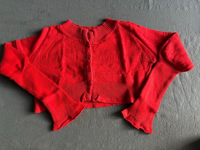 joli gilet boléro court rouge en tricot pour petite fille de la marque « Clayeux ». Motifs ajouré. En très bon état.
