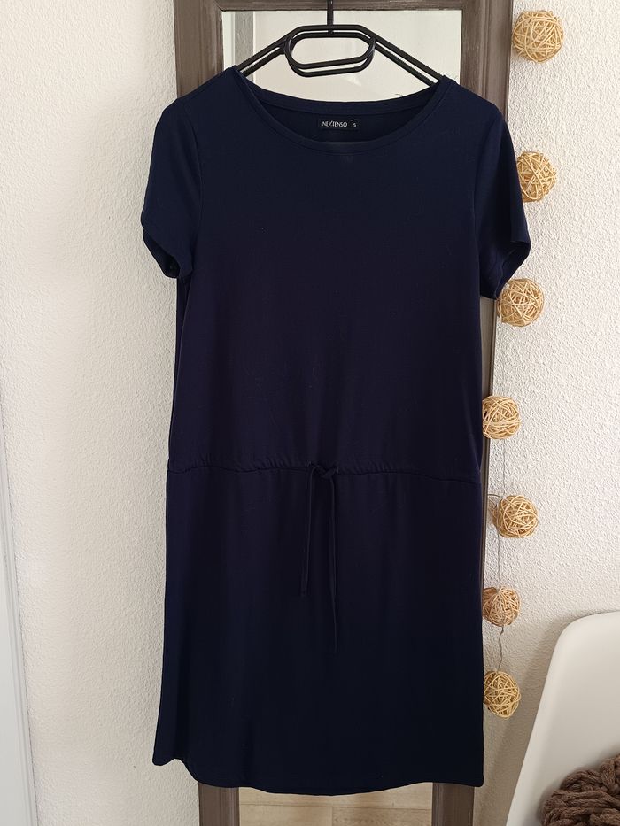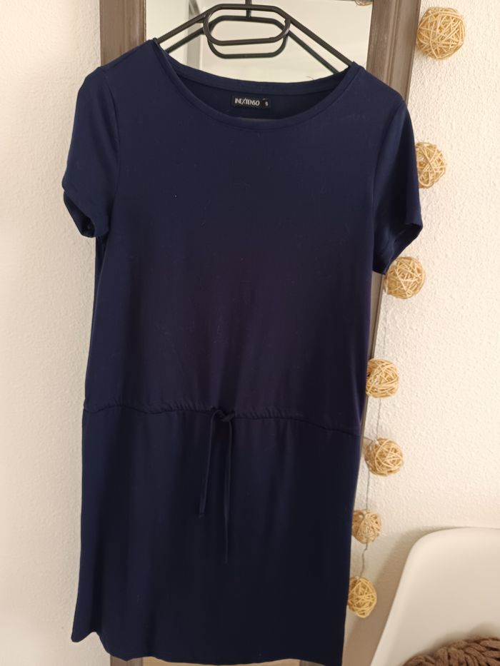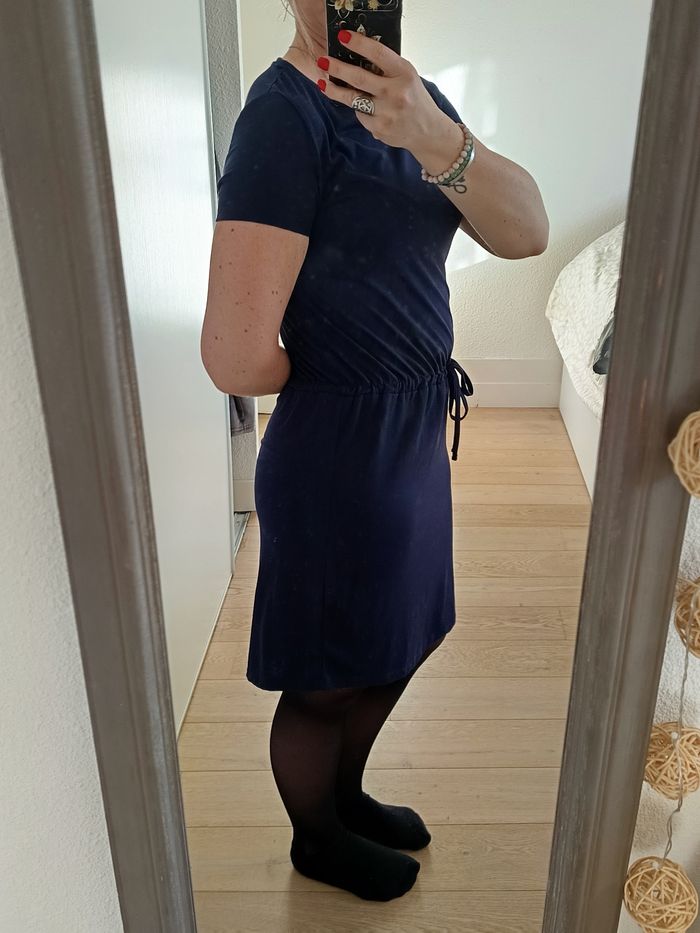 Robe mi longue bleu marine, resserrée par la taille avec un cordon justable. Taille S de la marque In Extenso, très bon état.