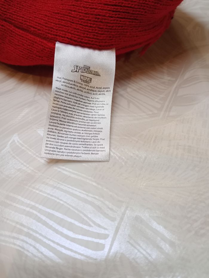Bonnet Spiderman pour enfant. Il est neuf car déjà trop petit. Il y a juste le prénom écrit sur l'étiquette à l'intérieur. Largeur : 18 cm. Hauteur déplié : 25 cm.