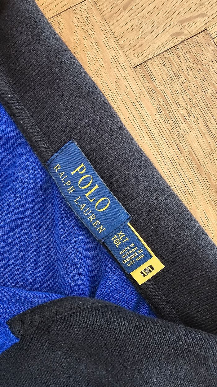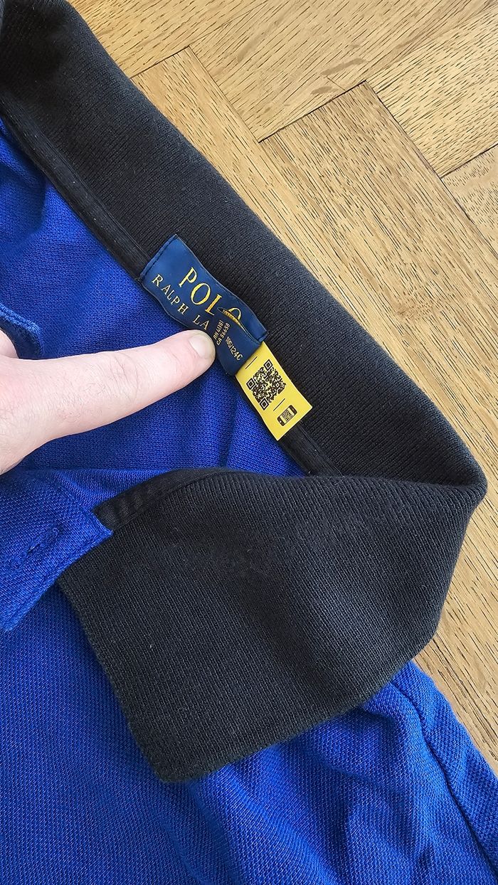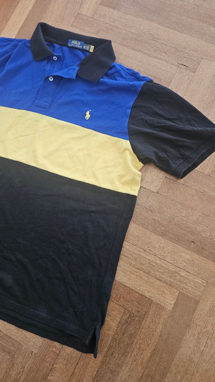 Polo ralph lauren. Avec qr code. Donc authentification possible et faite. J'ai le screen si besoin. Grosse bande bleu jaune noir. Taille XL. Pour toutes questions ou autres n'hésitez pas. Cordialement