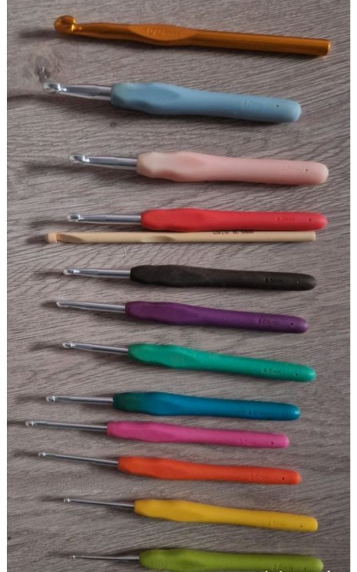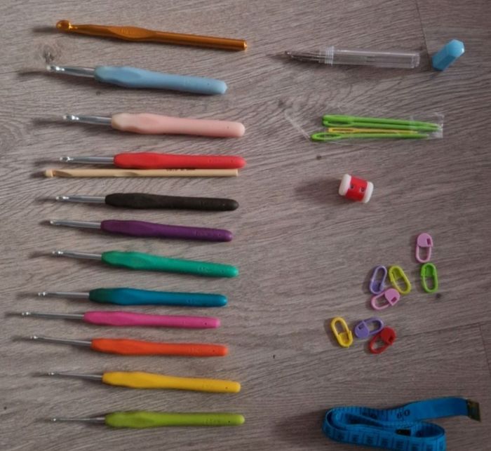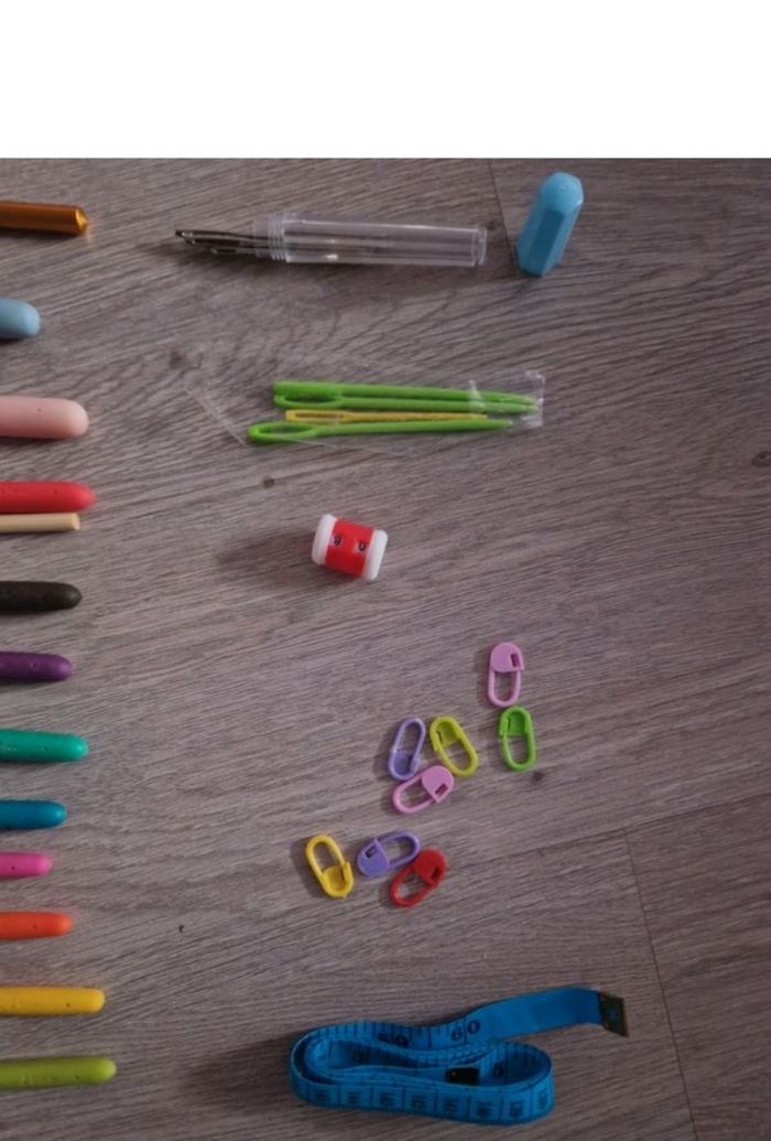 Le détail: ^ crochet n° 2-2,5- 3 -3,5-4-4,5 -5-5,5- 2 de 6 - 7 - 8 et 10 ^10 aiguilles à laine ^1compte tour ^8 marques maille ^1mètre ruban