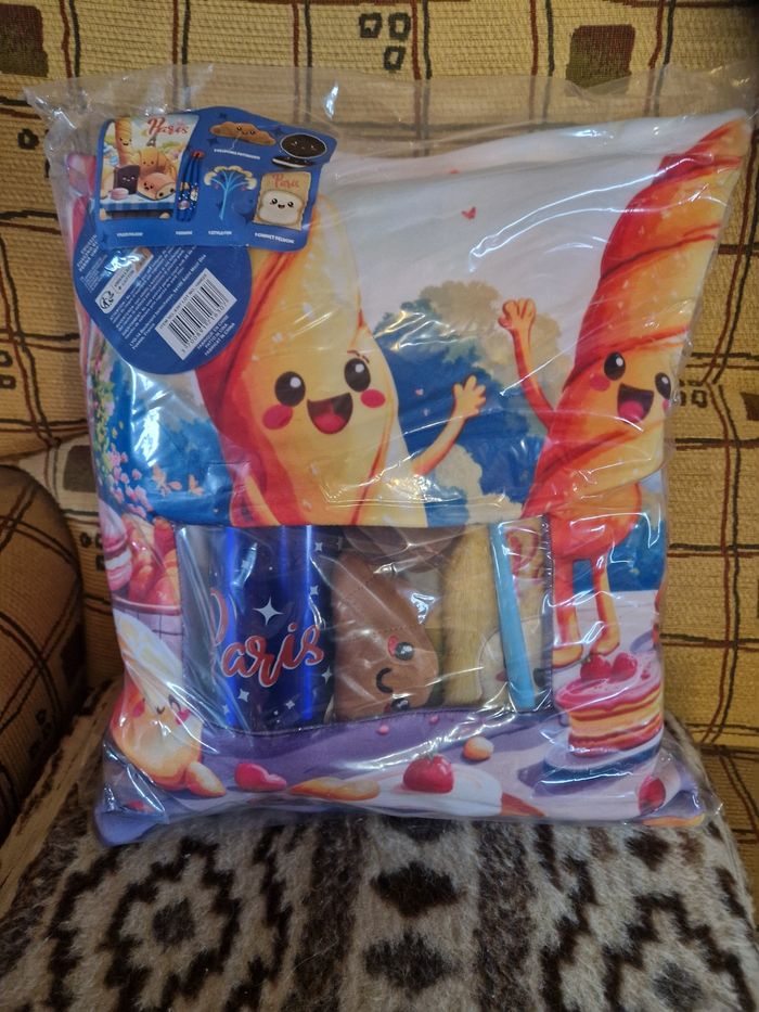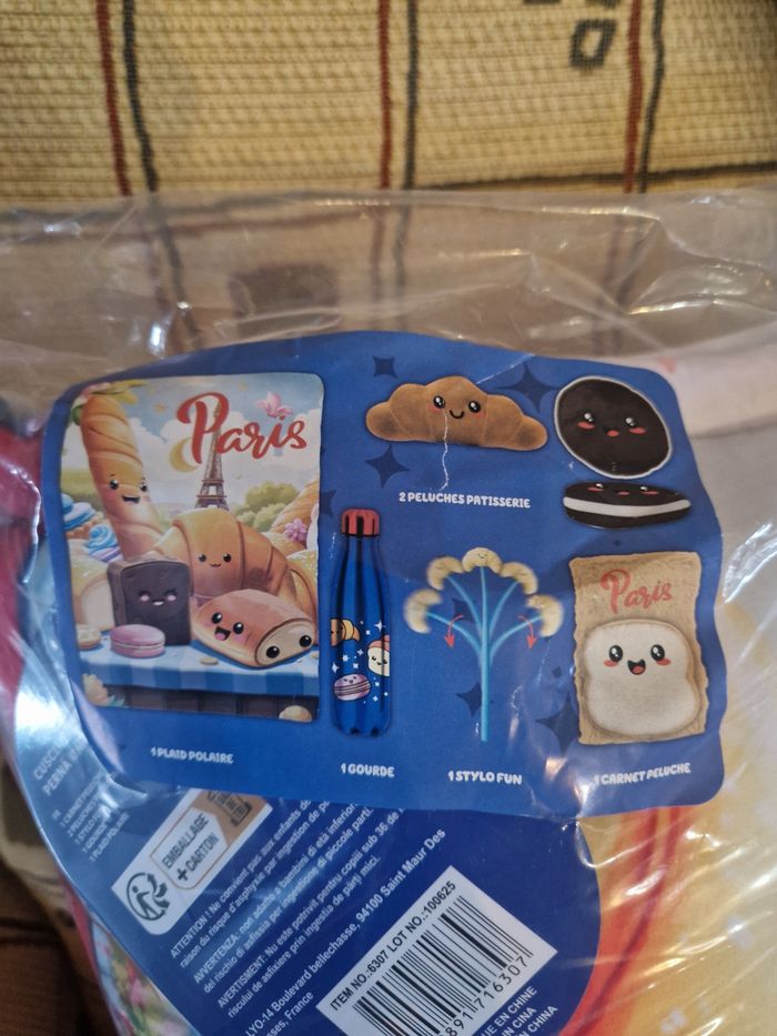 Interieur du sac ,1 plaid ,1 gourde ,1stylo fun ,1 carnet peluche ,2 peluches patisserie