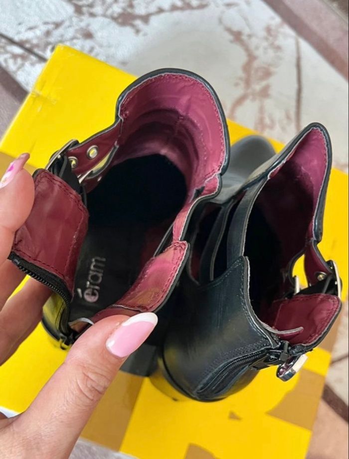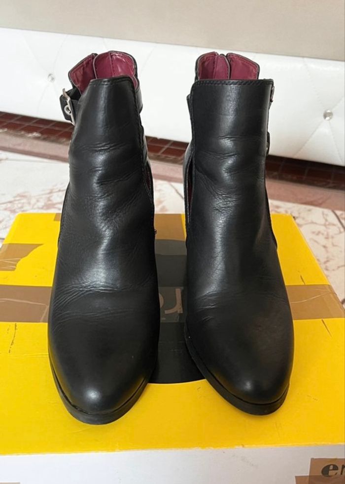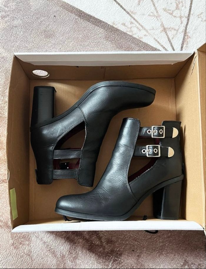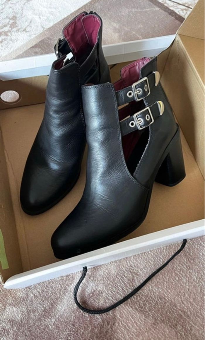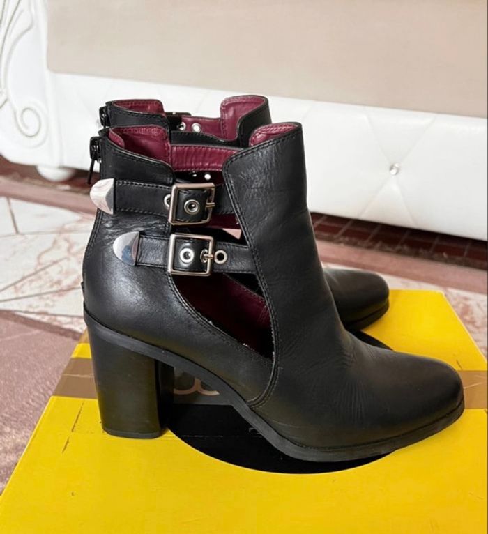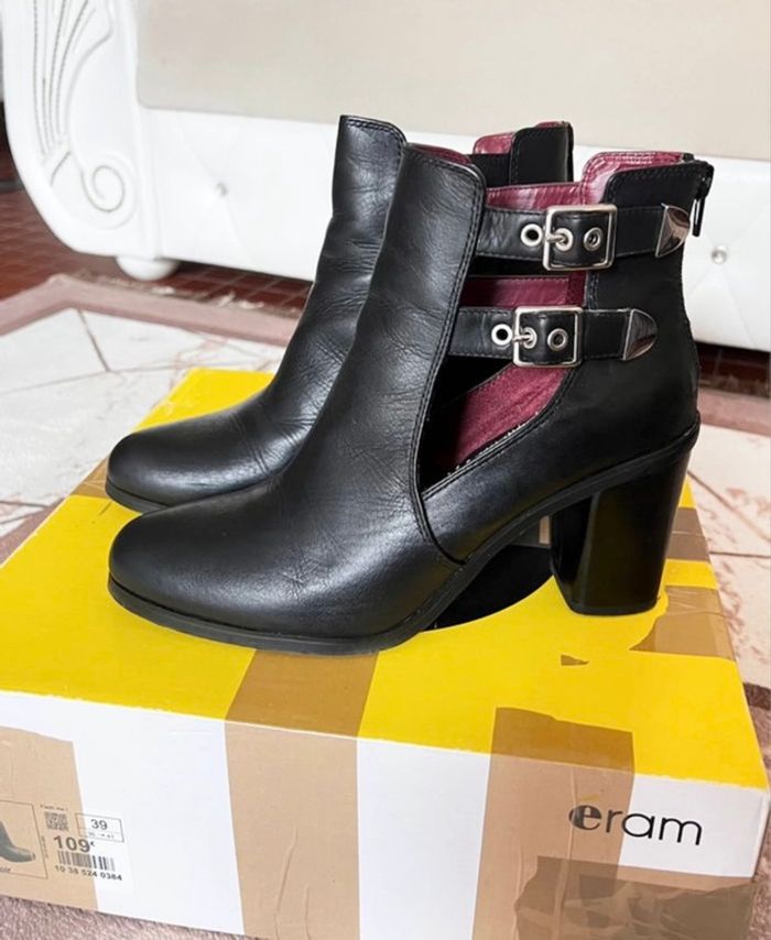 Paire de bottines à talons de 8 cm Marque Eram Pointure 39 En cuir Coloris noir Avec deux boucles sur les côtés Fermeture éclair à l'arrière Très peu portées Quelques traces discrètes Je réponds rapidement aux messages Envoi rapide et soigné