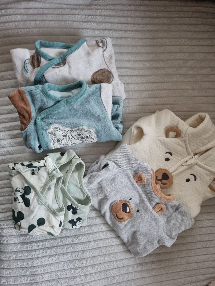 2 pyjamas Disney "Tic et Tac" , 2 bodys manches longues "Mickey", 1 combinaison ourson et 1 pyjama ourson. Les vêtements ont été utilisés 2 à 3 fois par bébé , les bodys les étiquettes ont été coupé (pour pas irrité la peau 😀). La combinaison quasi neuve utilisée 1 fois.