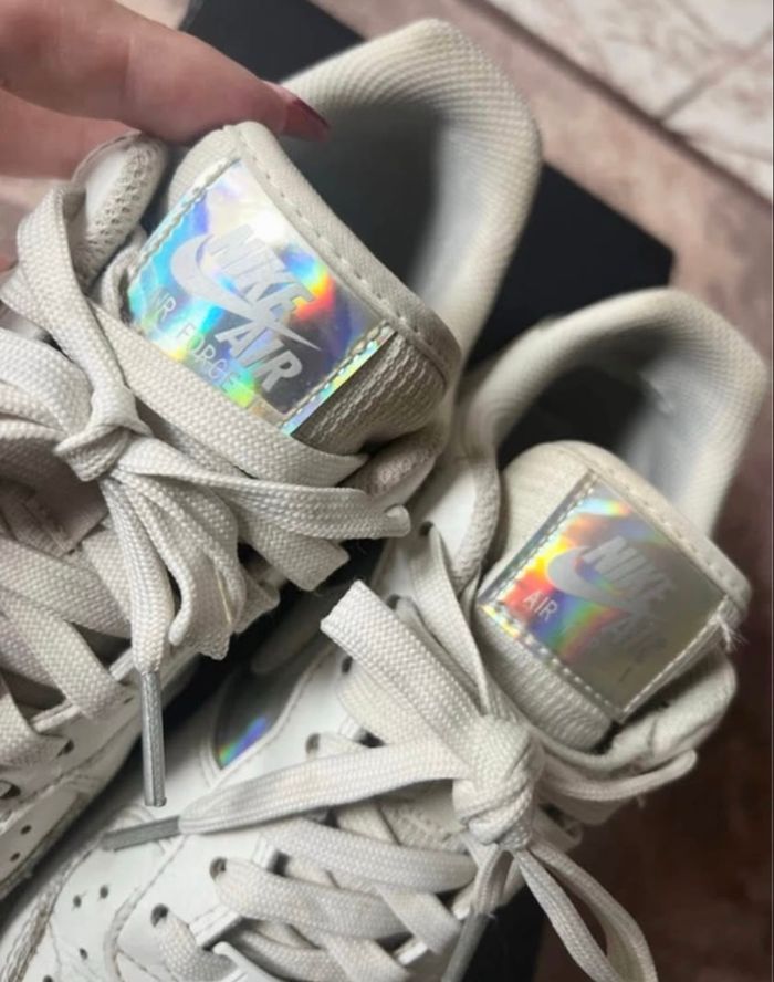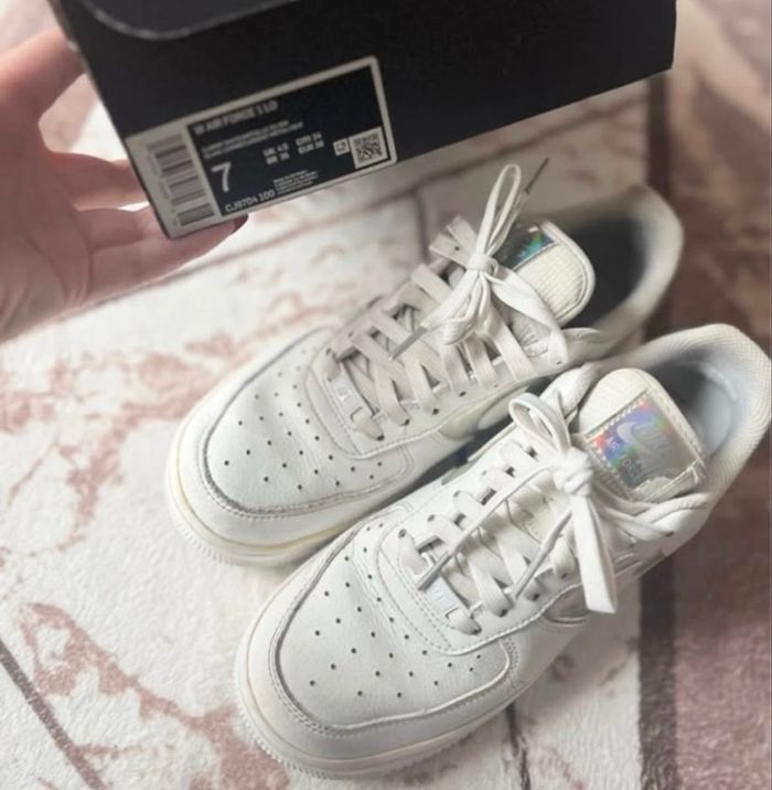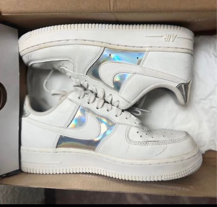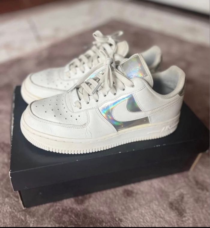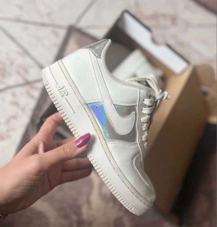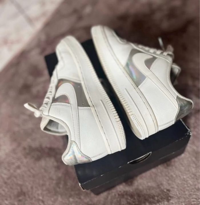 Baskets Nike Air Force 1 Pointure 38 Coloris blanc et argent métallique Partie argentée holographique En cuir Paire vendue dans sa boîte d'origine Quelques traces par endroit Je réponds rapidement aux messages Envoi rapide et soigné