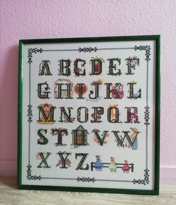 Vends un grand cadre abécédaire brodé point de croix sous verre style Sarah kay, je vends aussi d autres articles pensez à faire un lot pour activer la réduction et économiser sur les fdp