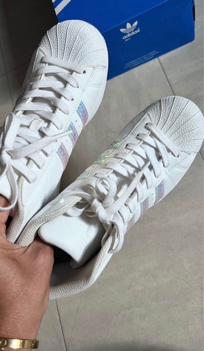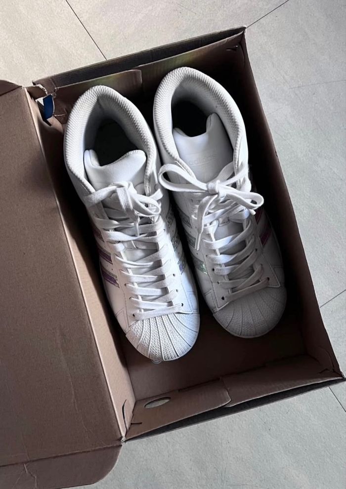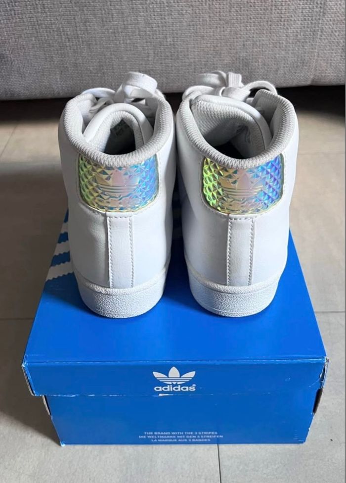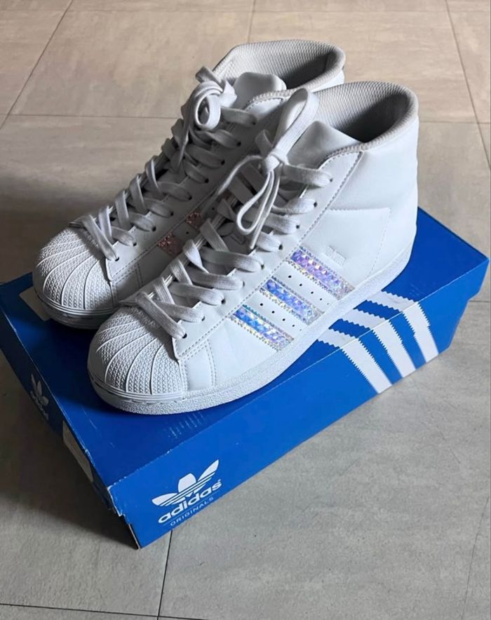 Baskets Adidas Pro Model J - édition iridescente Pointure : 38 2/3 Coloris blanc avec bandes holographiques iridescentes Paire vendue dans sa boîte d'origine Style classique type Superstar montantes avec effet brillant sur les 3 bandes Je réponds rapidement aux messages Envoi rapide et soigné
