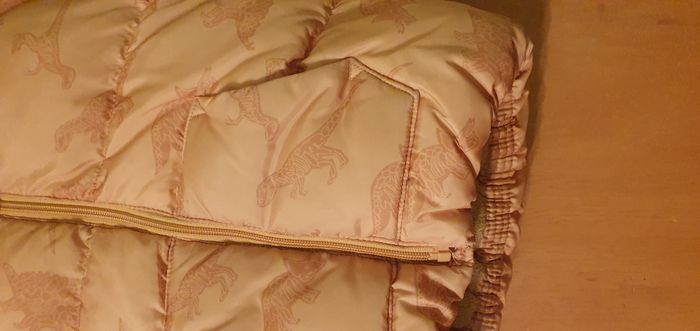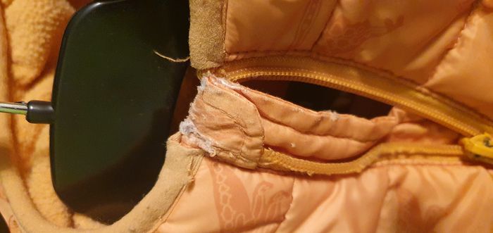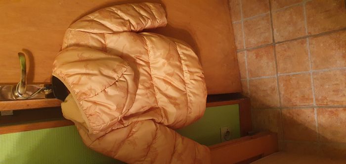 Doudoune enfant taille 4 ans, marque Kiabi, 100% polyester, coloris jaune moutarde brillant, extérieur avec motifs dinosaures ton sur tons, intérieur polaire, très chaud, avec capuche et 2 poches ventrales, légèrement usé sur le rabat protecteur haut de la fermeture éclair, mais ne gêne absolument pas (voir dernière photo)