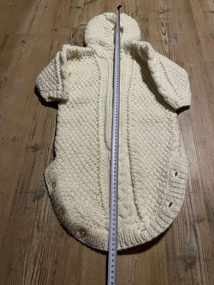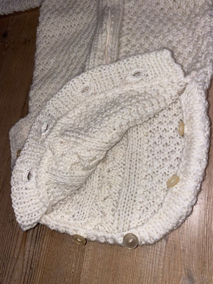Gigoteuse beige écru. Entièrement fait main. Avec capuche. Fermeture zippée et boutons pour le change. Super chaude et très jolie. Mixte fille ou garçon. Taille longueur 80 cm de la naissance à 6 mois environ.