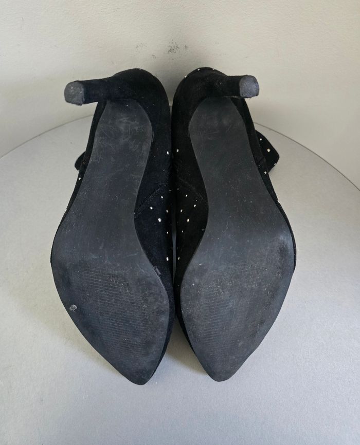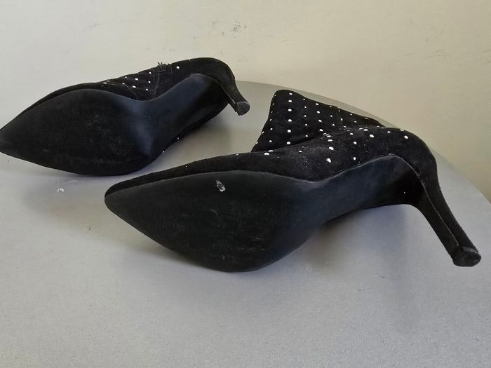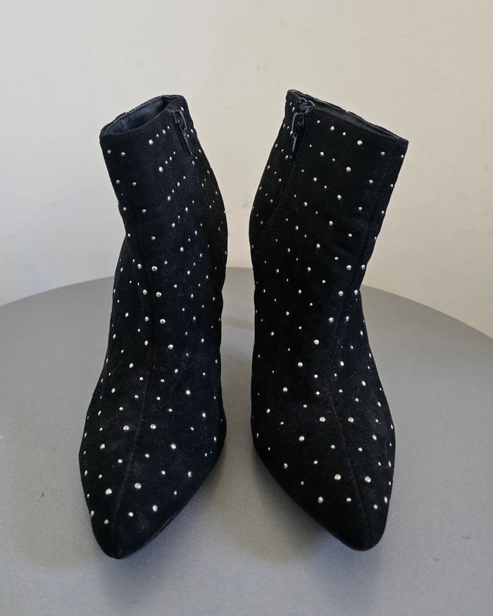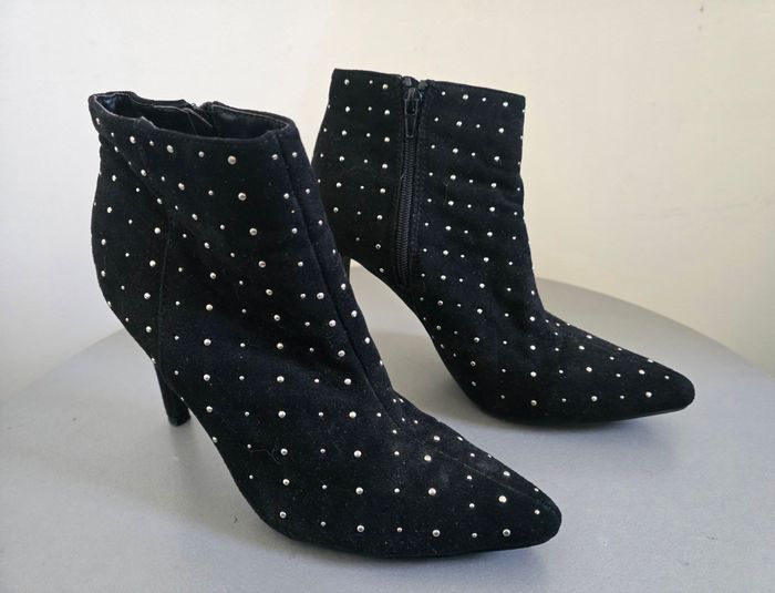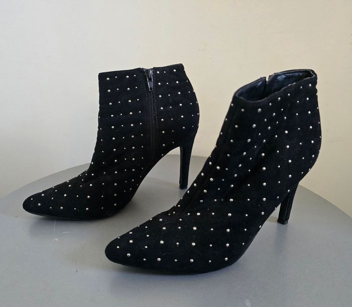 ✅ Bottines à talons Pimkie noires avec petits clous/perles argentés - TBE - Pointure 38 ✔ look "Rock & Rebelle" ou "Chic & Soirée" ✔ Bout pointu et fermeture zippée sur le côté intérieur ✔ en suédine - Hauteur de talon 10 cm (mesure prise en haut du talon) ✔ envoi rapide et soigné - remise sur lot