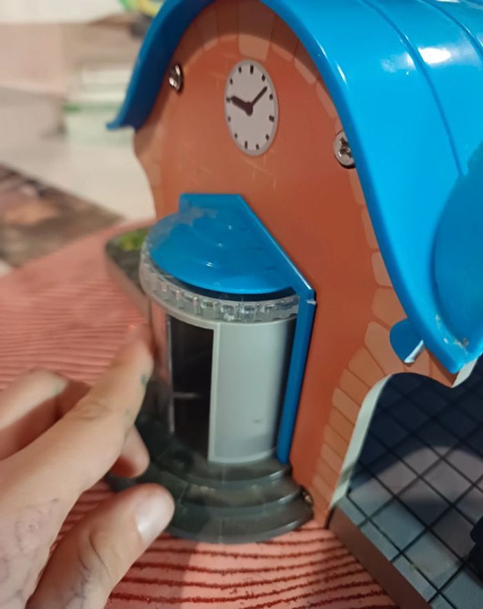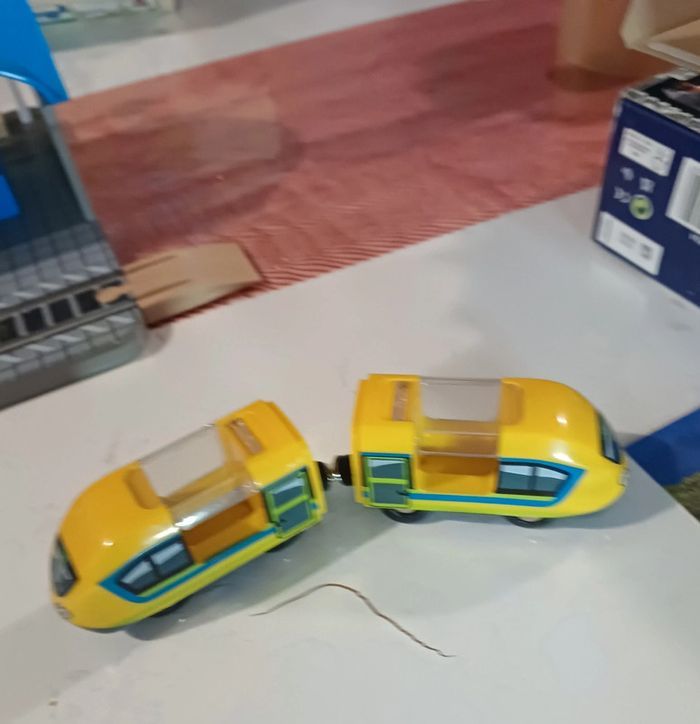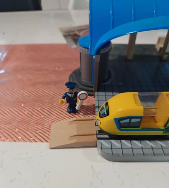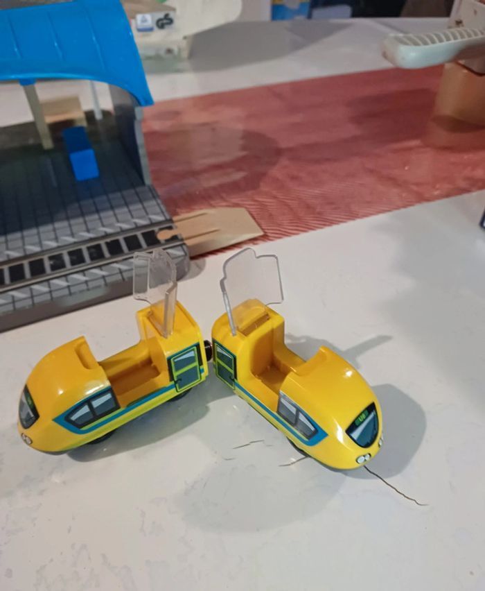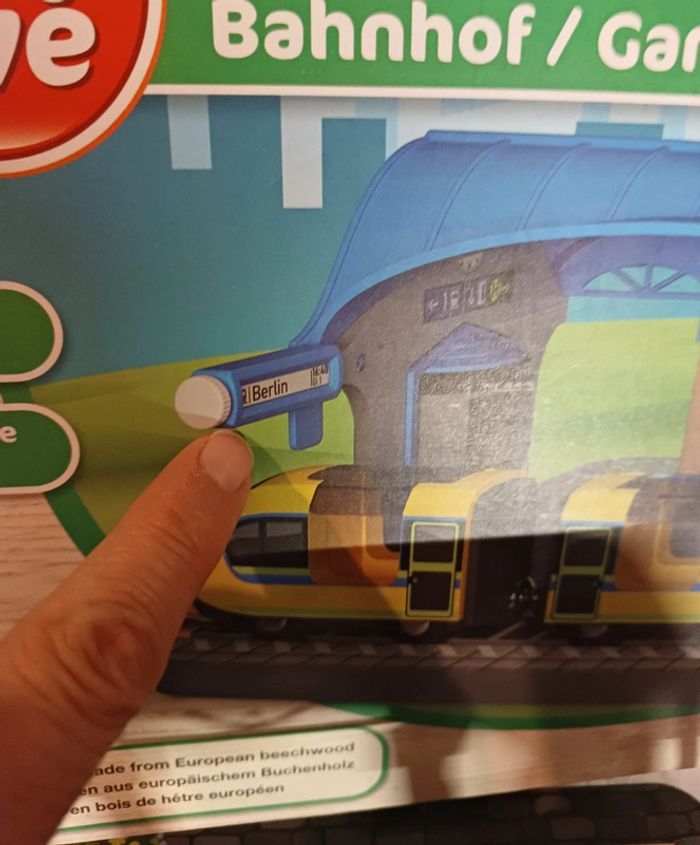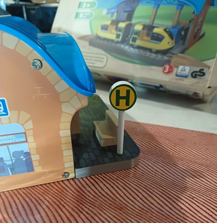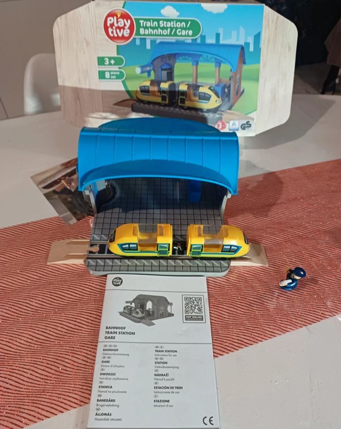 Jouet en bois train, playtive lidl, Sur la gare le panneau destination est cassé et le.plateau a des "pics"voir photo Le haut du sas à ete recollé (photo ) Complet, boîte notice Noël 2023 #jouet_mondressing11_bv