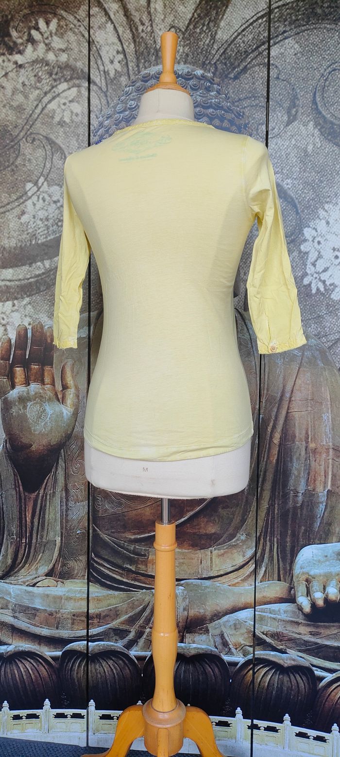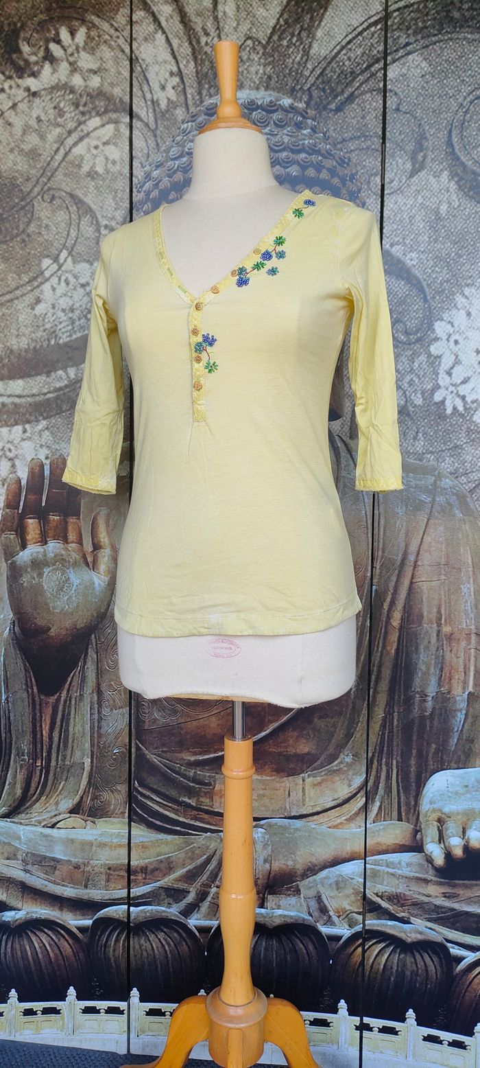 Haut léger R95th, confortable et féminin. Coupe fluide, joli décolleté brodé et matière agréable à porter, parfait pour le printemps ou l’été. ✨ Détails Marque : R95th Taille : XS Couleur : jaune pâle Mesure aisselle à aisselle : 39 cm Longueur : 62 cm Détails : broderies décoratives, patte de boutonnage État : très bon état, aucun défaut Envoi rapide et soigné.🌸