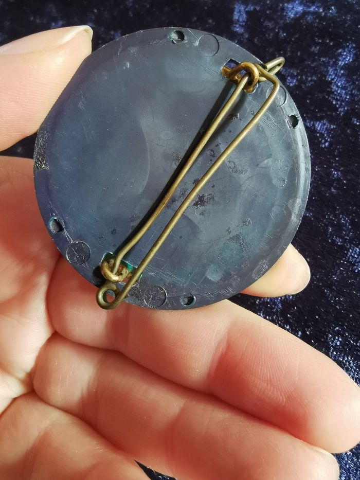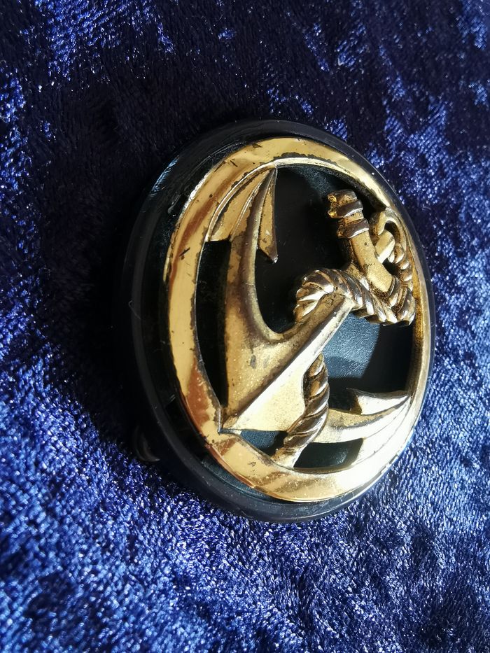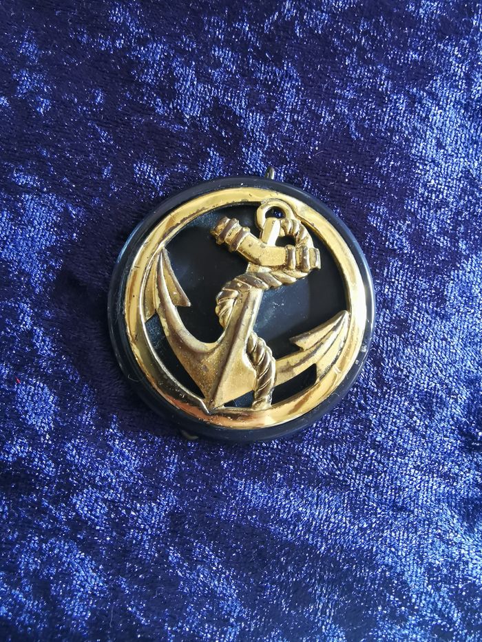 Broche insigne troupe marine Ancre vintage. Bon état général, l'ancre en métal doré est oxydé, il est collé sur le support en plastique bleu marine, bon état général. Dimensions : Diamètre : 5 m Epaisseur : 5 mm Poids : 18g