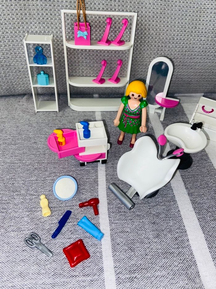 ⚠️ Prix ferme ⚠️ Playmobil le coiffeur Avec 2 coiffeuses Bac pour laver les cheveux Étagères Produits de coiffure et beauté Ciseau shampooing spray Tous les accessoires