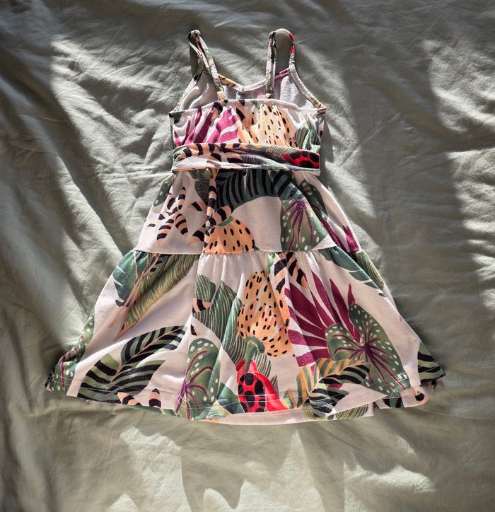 ​✨ ÉTAT : Très bon état. Les couleurs tropicales sont restées bien vives et le tissu ne présente aucun signe d'usure. ​📏 TAILLE & COUPE : 2 ans (2Y). Coupe fluide avec bretelles fines et une jolie ceinture à nouer à la taille pour un ajustement parfait. ​🌿 MATIÈRE : 95% Polyester, 5% Spandex. Un tissu léger, fluide et légèrement extensible. Jolis détails de boutons décoratifs sur le devant. ​👩‍👧 LOOK MÈRE-FILLE : Je vends également la même robe pour femme en taille M dans mon dressing ! Idéal pour un look duo adorable cet été. ​📦 LIVRAISON : Envoi via Mondial Relay (lockers), Shop2Shop ou Chronopost (point relais physique). ​🎁 Réductions sur les lots activées ! Profitez-en pour prendre l'ensemble mère-fille à prix réduit.