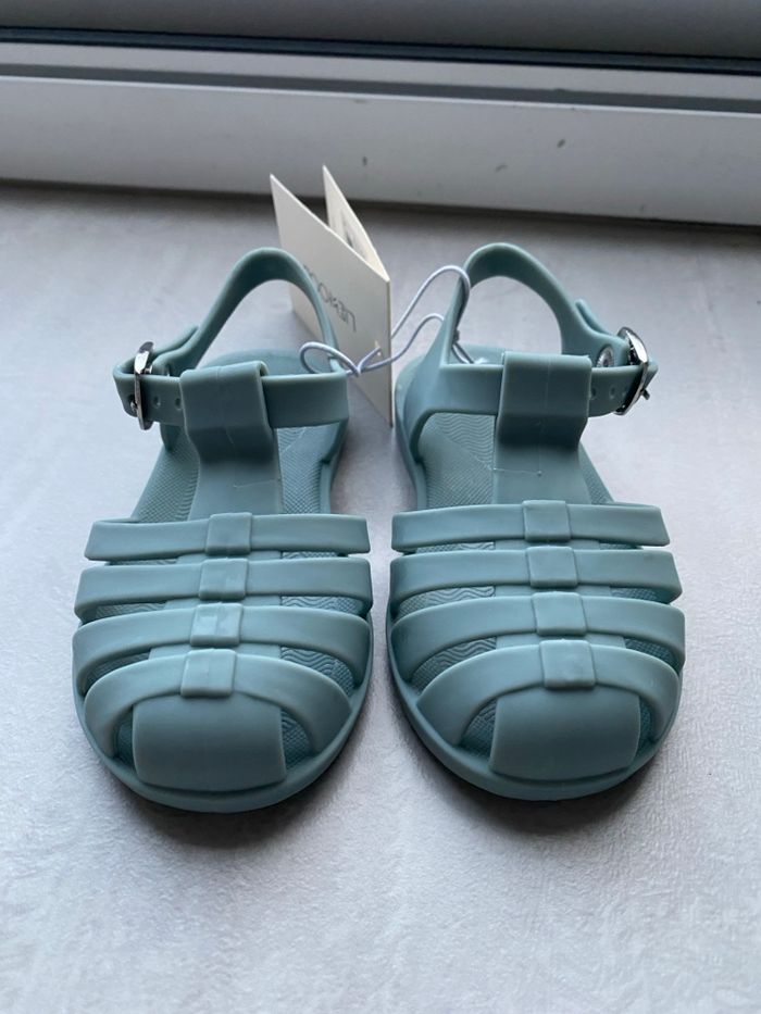 🌊 Sandales de plage Liewood - Modèle Bre (Neuf) Vends une paire de sandales de plage (type "méduses") de la marque scandinave Liewood, modèle Bre. Elles sont parfaites pour protéger les pieds de votre enfant à la mer, à la piscine ou dans le jardin. • État : Neuf avec étiquette d'origine 🏷️ • Pointure : 22 (taille UK 6 indiquée sur la semelle) • Couleur : Peppermint (un joli vert d'eau/bleu pastel) • Matière : 100% PVC souple, sans BPA. Très confortable et flexible pour les premiers pas. • Détails : Fermeture par boucle métallique réglable avec bouton pression pour les enfiler et les retirer facilement. Semelles qui laissent des traces de pas rigolotes en forme de panda dans le sable ! 🐼 Paire légère, facile à nettoyer et ultra stylée pour l'été. 🏷️ Hashtags #liewood #sandalesliewood #liewoodbre #pointure22 #sandalesplage #medusesenfant #modeenfant #peppermint #scandinaviandesign #bebe22 #chaussuresete #neufavecetiquette #vancances #piscine #plage