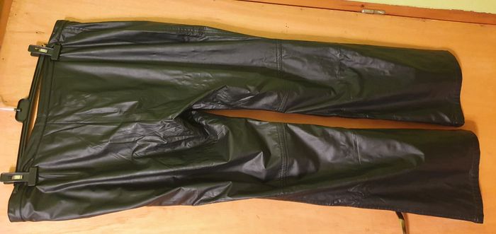 Joli pantalon 100% polyester enduit PVC polyuréthane, souple, taille 50, coloris noir, ceinture montée avec fermeture éclair de 17cms et boutonnage croisé invisible sous patte, empiècement couture niveau genoux, largeur taille 50,5cms, largeur bassin 63cms , hauteur entrejambe/taille 35cms, longueur entrejambe/ourlet 80cms, largeur jambe 24cms, longueur totale 108cms.