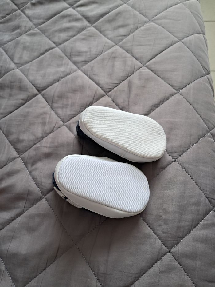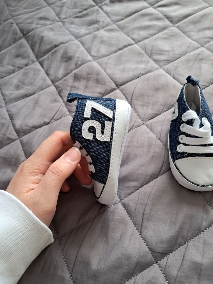 Petites baskets style "Converse" bleues et blanches - Taille Naissance ​Vends cette paire de petites chaussures souples pour bébé (type chaussons de parc). Très mignonnes avec leur style indémodable, elles sont parfaites pour compléter une tenue décontractée. ​Couleur : Bleu marine effet denim avec détails blancs (lacets, bout et semelle). ​Détail : Chiffre "21" blanc brodé sur le côté extérieur. ​Confort : Semelle souple en tissu, idéale pour les bébés qui ne marchent pas encore afin de ne pas comprimer leurs pieds. ​Fermeture : Lacets blancs. ​État : Très bon état, semelles impeccables. ​Note : Pas de taille indiquée sur l'étiquette, mais correspond environ à une taille 16/17 (0-6 mois selon la croissance de bébé). ​ ​#bebe #chaussuresbebe #chaussonsbebe #naissance #babyboy #babyshoes #babysneakers #denimstyle #babyfashion #vetementbebe #puericulture #firstshoes #tenuebebe #modebebe