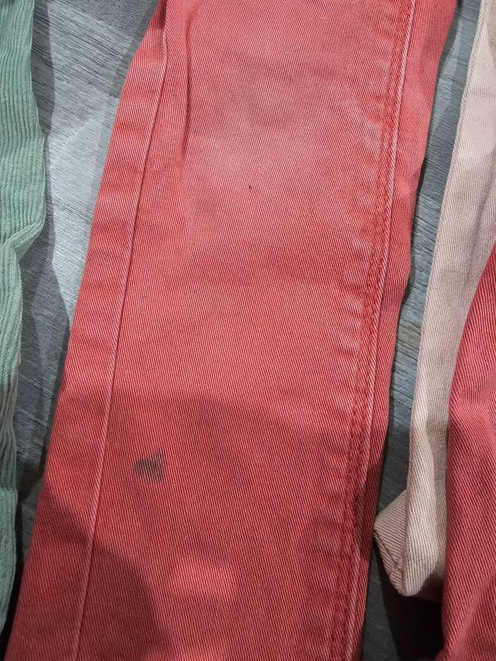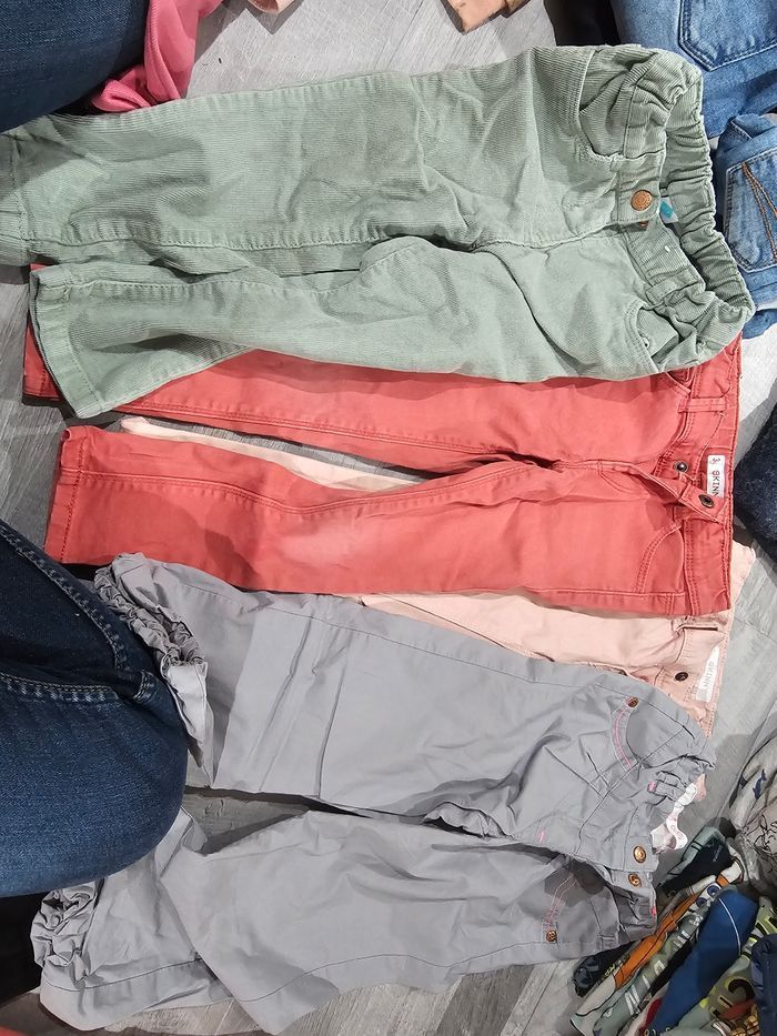 Lot de 12 pantalons + 1 pantacourt : 2 avec des tâches et un ou il manque le boutons du milieu. Voir les différentes photo. Différente marque. + 1 lot de 6 leggings que je donne avec car tâches ( peu servir en pyjama par exemple ). #lot #pantalon #leggings #3ans