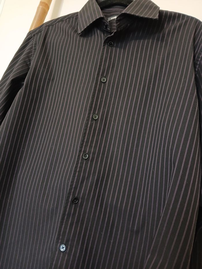 Jolie chemise homme à rayures violettes, taille L, marque Celio.