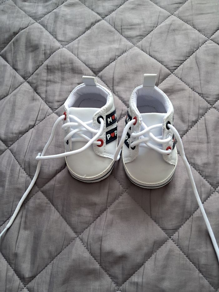 Petites Baskets Bébé "I Love Mom & Papa" ​ Vends cette adorable paire de petites baskets souples pour bébé, couleur blanche avec des détails "I ❤️ MOM" et "I ❤️ PAPA" sur les côtés. ​État : Neuf / Très bon état (portées une ou deux fois maximum). ​Couleur : Blanc éclatant avec liserés noirs et rouges. ​Style : Type baskets de ville avec lacets blancs. ​Confort : Semelles souples en tissu, idéales pour les bébés qui ne marchent pas encore ou qui commencent à se tenir debout. L'intérieur est doublé et confortable. ​Petit plus : Parfait pour un cadeau de naissance ou pour une séance photo mignonne en famille ! ​ ​ #bebe #chaussuresbebe #basketsbebe #naissance #cadeaunaissance #bebegarcon #bebefille #maman #papa #modebebe #chaussuresouple ​ #babyshoes #babyfashion #newborn #infantshoes #babysneakers #momanddad #cutebaby #babygift #softsole #whitebabyshoes