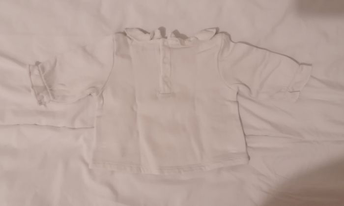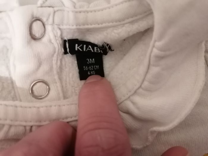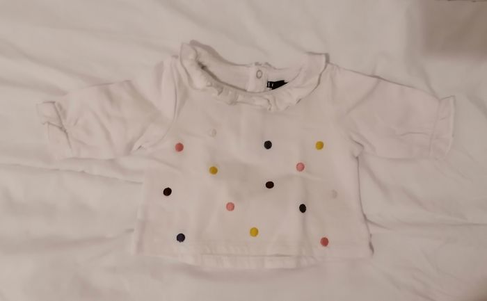 Pull blanc à motifs, taille 3 mois, marque Kiabi, en bon état.