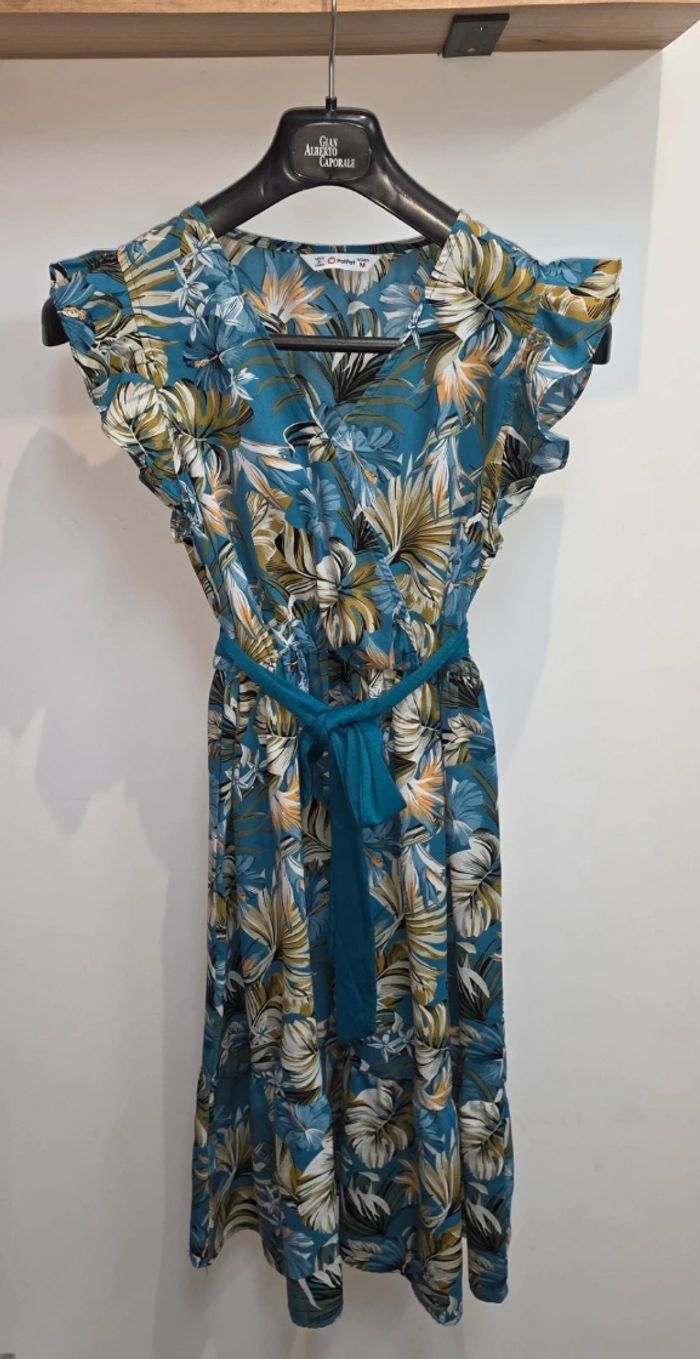 ​✨ ÉTAT : Très bon état. Portée seulement quelques fois, le tissu est impeccable et les couleurs tropicales sont restées très belles. ​📏 TAILLE & COUPE : Taille M. Coupe longue et fluide, très flatteuse avec son décolleté croisé en V et sa taille marquée par une ceinture à nouer. Manches volantées légères. ​🌿 MATIÈRE : 100% Viscose pour la partie jupe, offrant un tombé fluide et très frais pour l'été. Le haut est un mélange doux et extensible. ​👩‍👧 LOOK MÈRE-FILLE : Je propose également la même robe pour petite fille en taille 2 ans dans mon dressing ! Parfait pour un look assorti en vacances ou pour une occasion spéciale. ​📦 LIVRAISON : Envoi via Mondial Relay (lockers), Shop2Shop ou Chronopost (point relais physique). ​🎁 Réductions sur les lots activées ! Profitez-en pour vous offrir le duo mère-fille à prix doux.